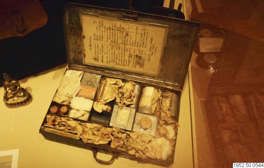 • Mecicinlåda, Sven Hedins reseapotek. Bilden är tagen av Axel Odelberg och använd i artikeln "Sven Hedins reseapotek väckte lamans nyfikenhet".