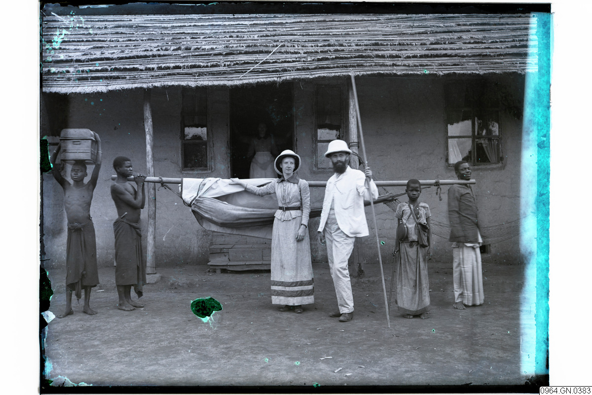 • Två missionärer, kvinna och man med skägg framför en bår/bärstol ("ambulans").