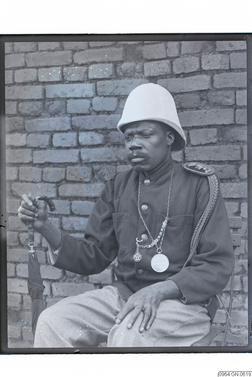 • Sittande man med tropikhjälm och paraply. Uniform, medalj. Jämför 0964.d.2068, samma tillfälle.