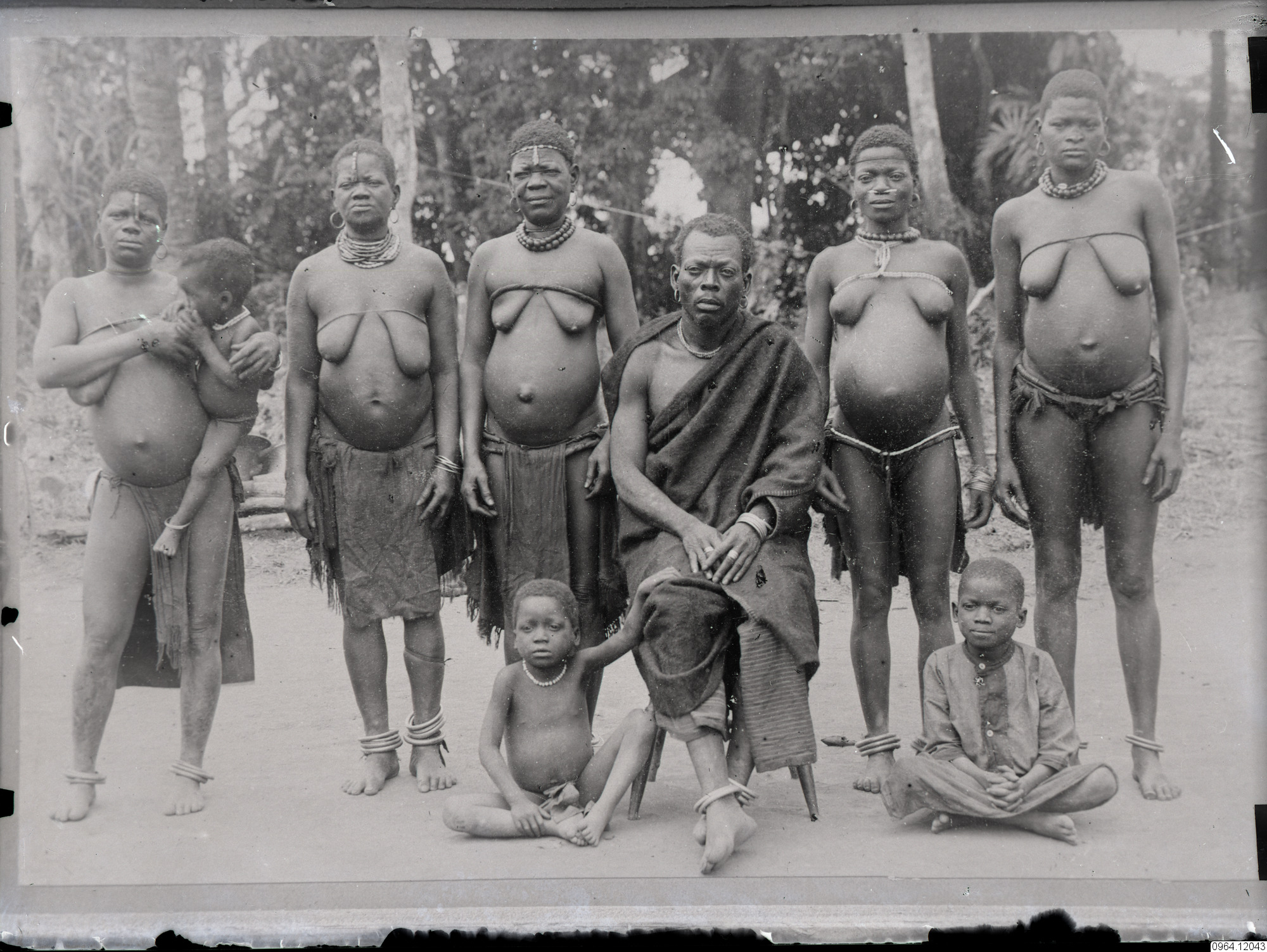Troligen hövdingen Makasa Biala (Biyala) vid Kingkenge med några av sina hustrur och barn. Kinkenge. 1899. K.J.P. (K.I.P.)Han sitter på en pall. Ankel-ring (gul metall). Jämför 0034.0010.c, samma tillfälle.