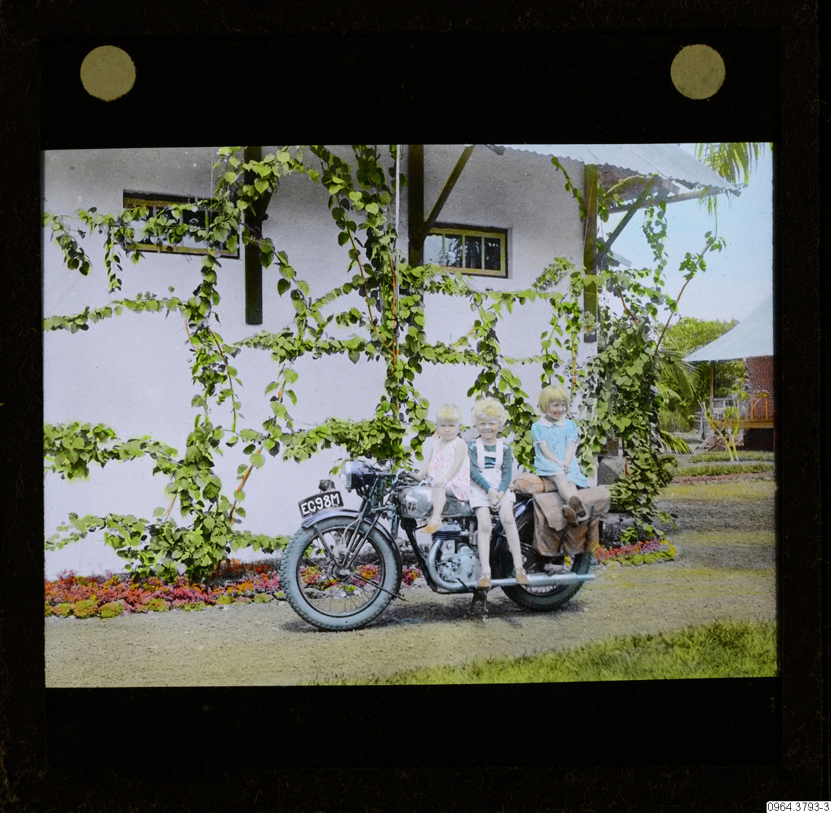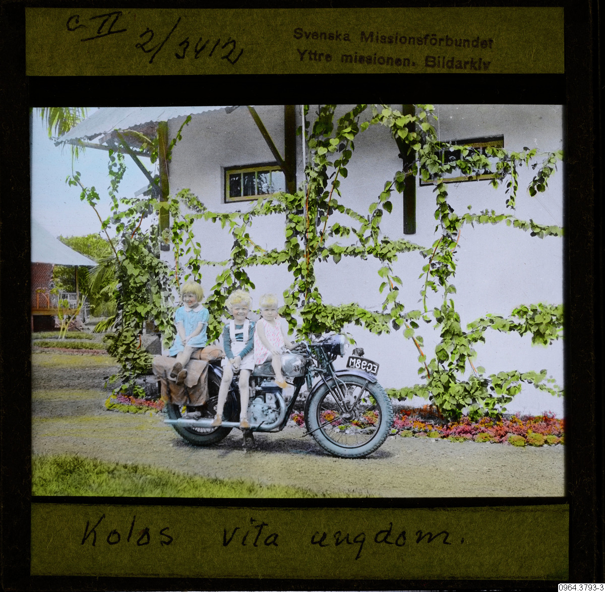 • Kolos vita ungdom på en motorcykel. Jämför bild 0964.9845, samma motorcykel. Sannolikt är ett av barnen Ingvar Jakobsson och hans syskon.