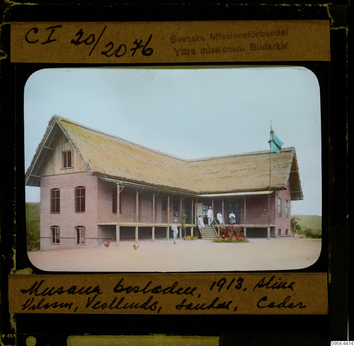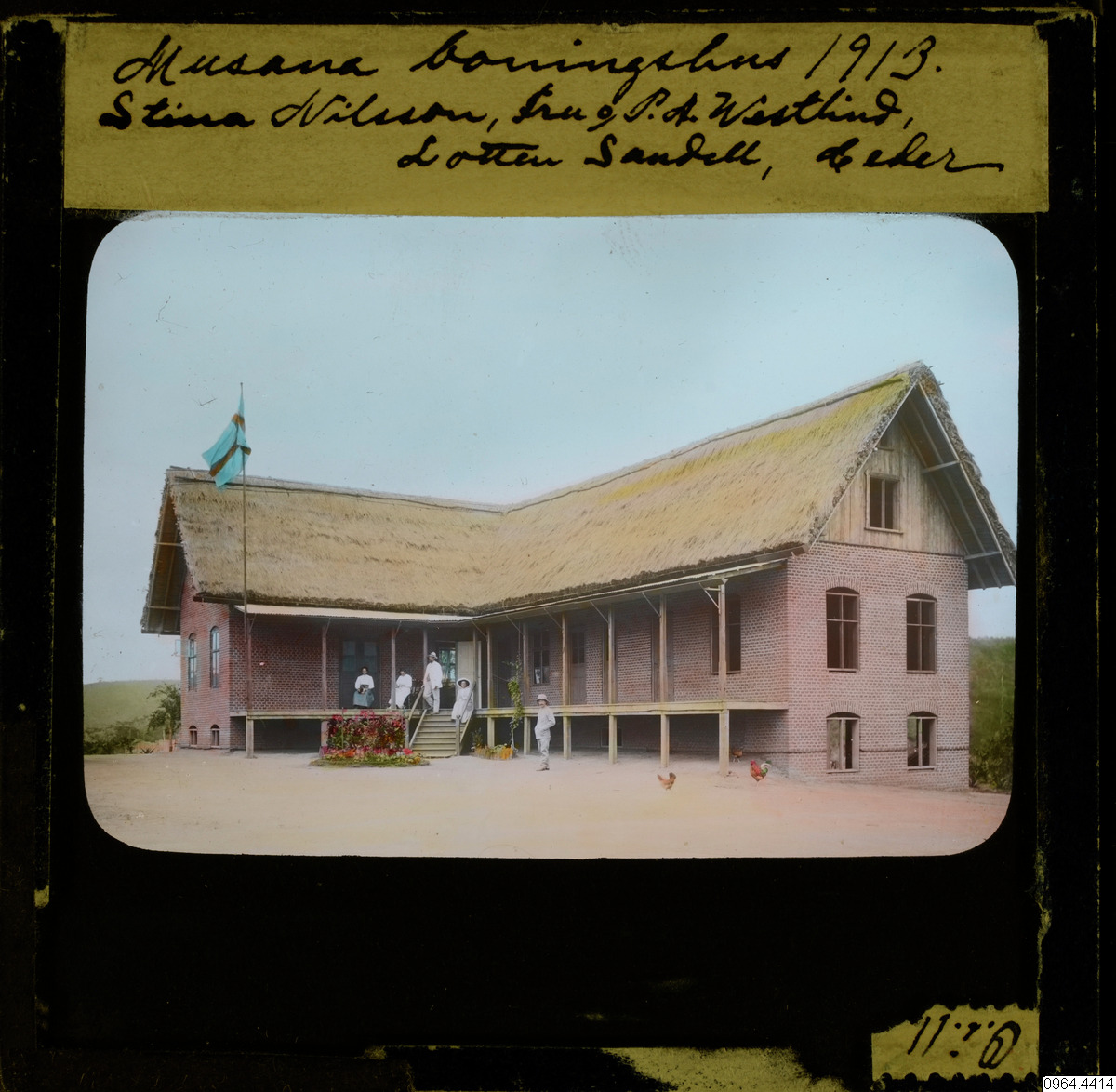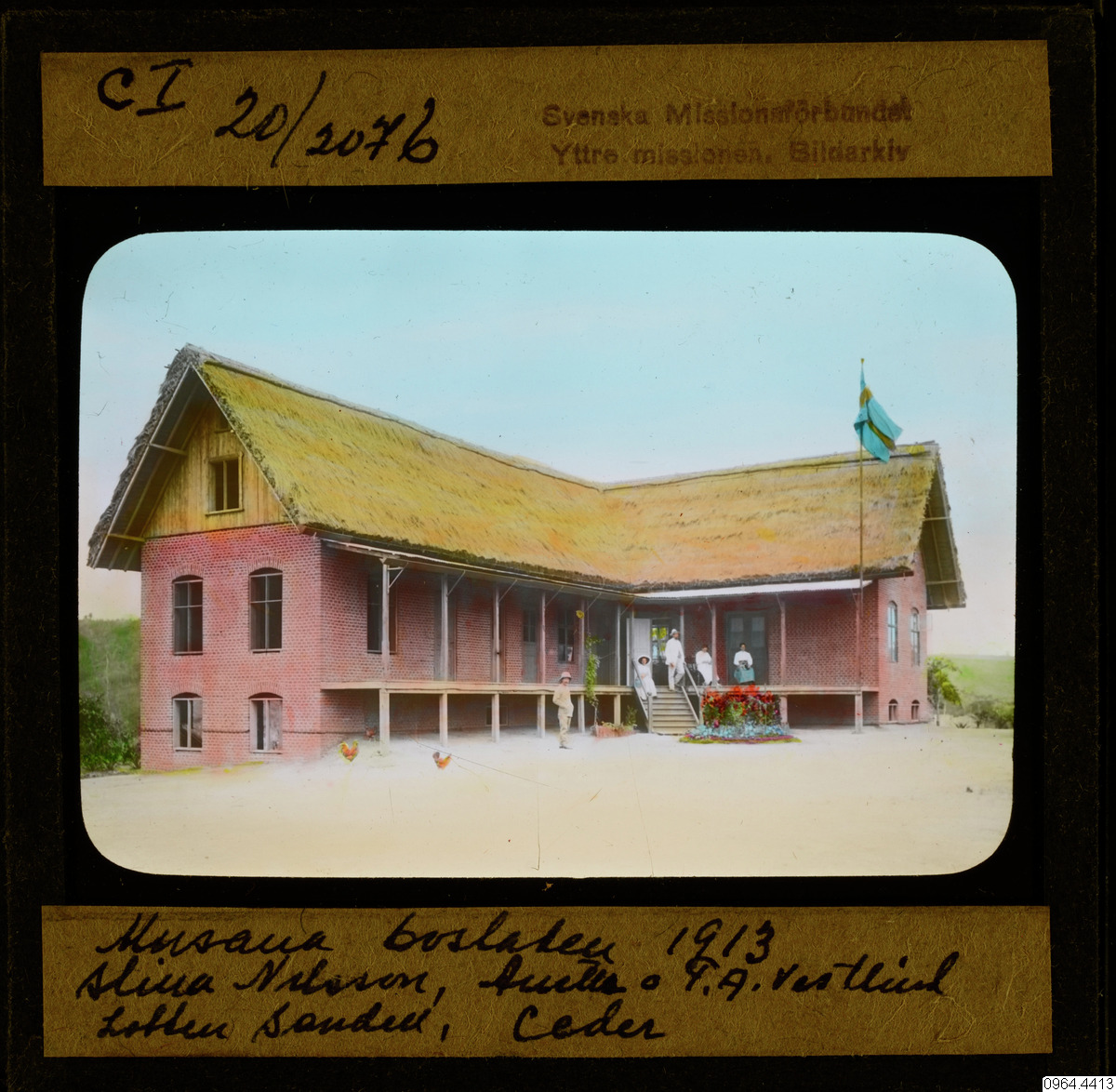 Musana missionsstation, bostaden/boningshuset. 1913. Stina Nilsson, Anette o P.A. Vestlind/Vestlund, Lotta Sandell, Ceder.