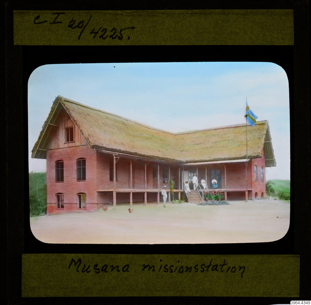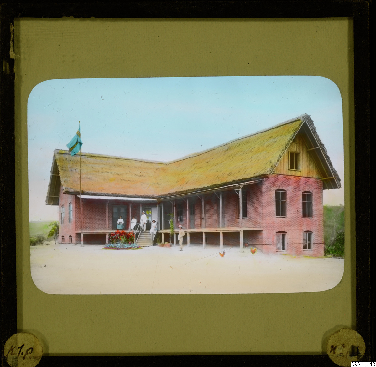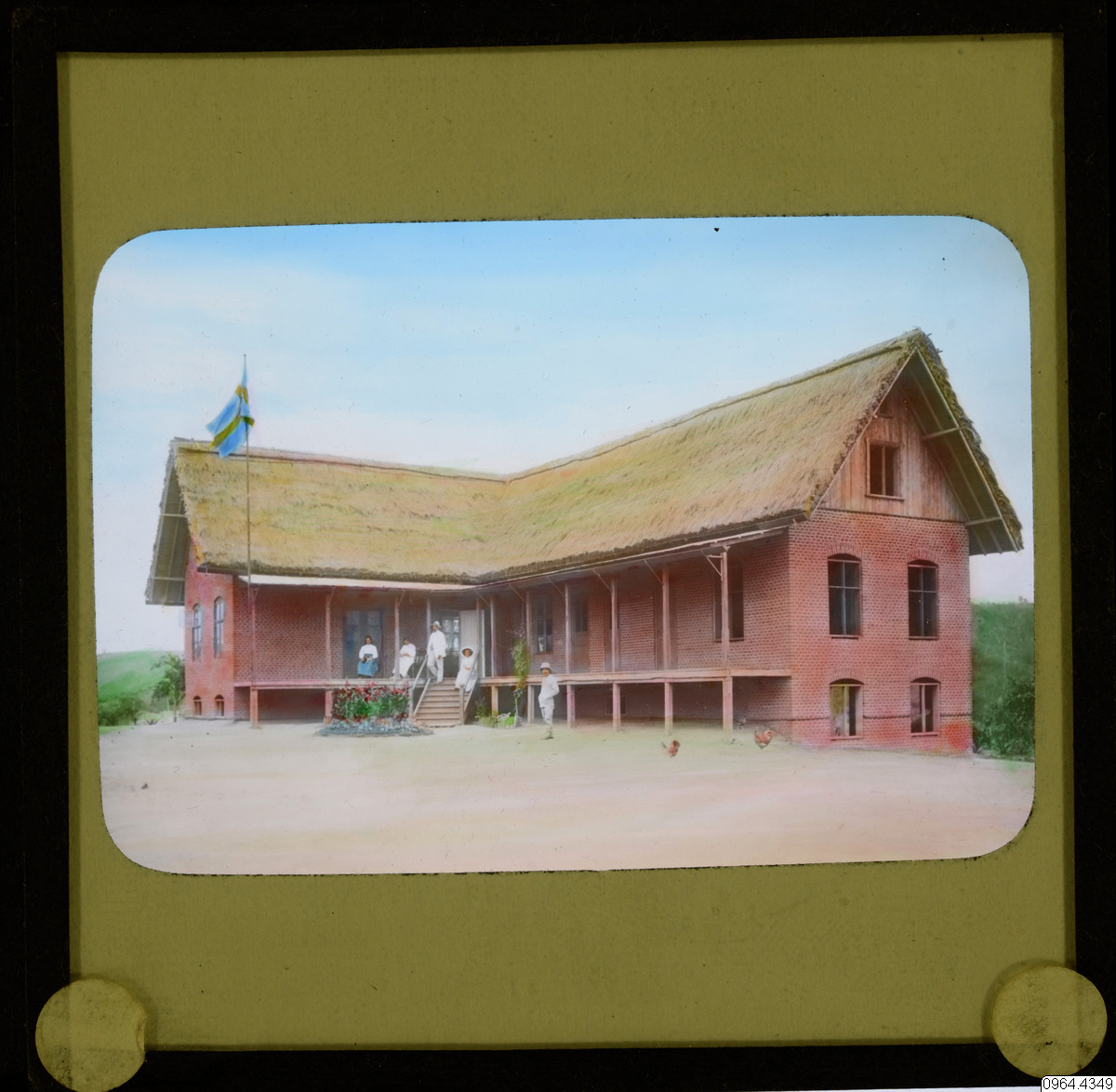 Musana missionsstation, bostaden/boningshuset. 1913. Stina Nilsson, Anette o P.A. Vestlind/Vestlund, Lotta Sandell, Ceder.