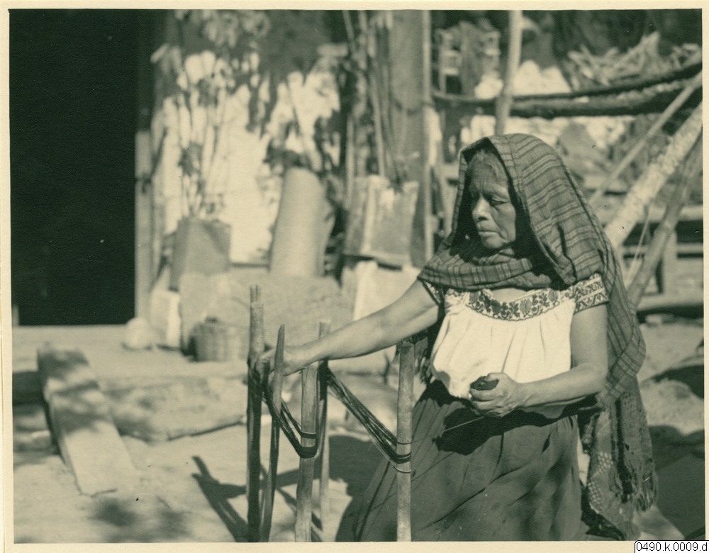 • Näringsgrenar i México. Vävning och sömnad m.m. Kvinna med garnnystan. Puebla. Xalacapa, Zacapoaxtla. Foto: Mrs Elsie Mac Dougal, U.S.A. (1930-talet).