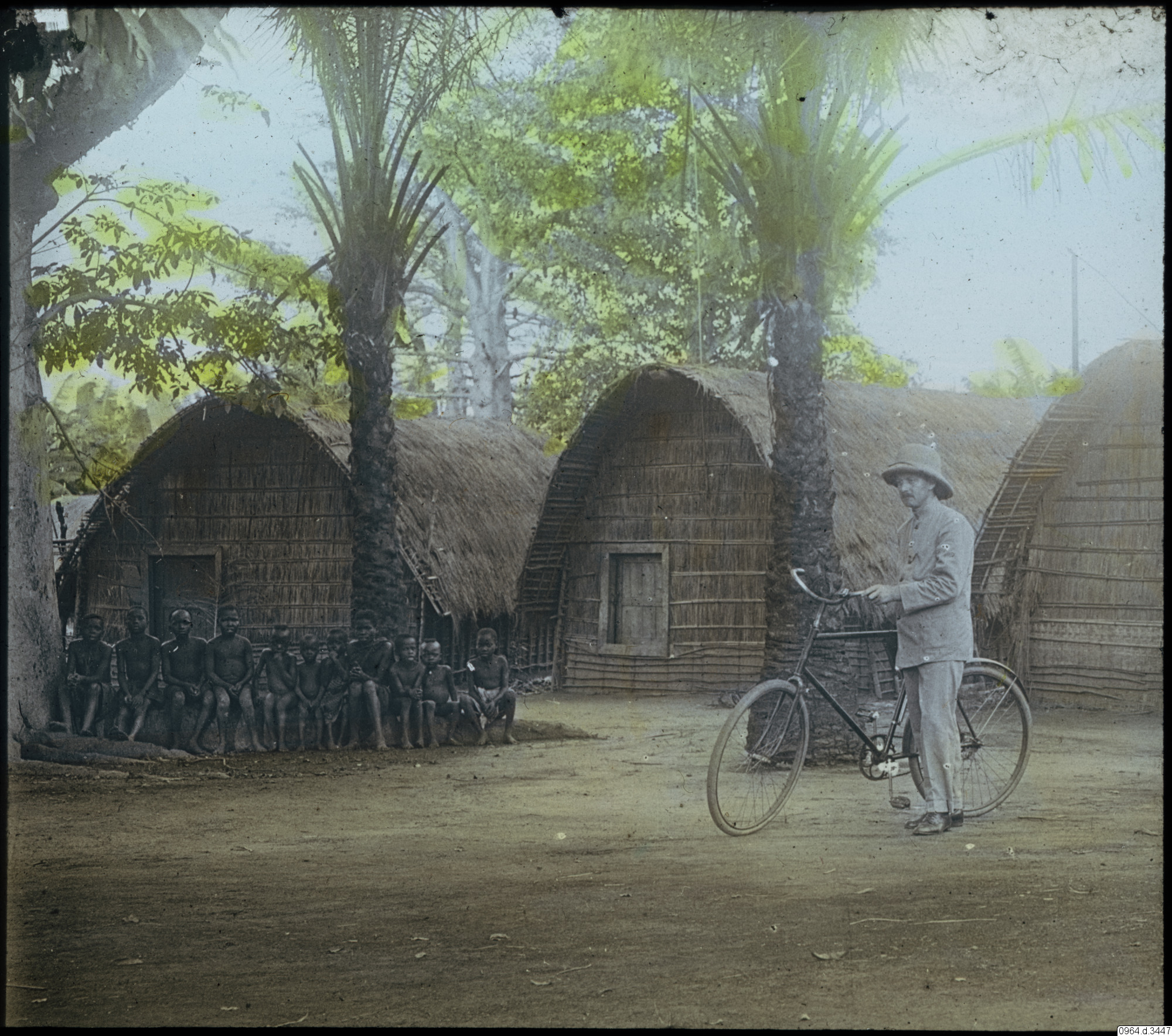 hyddor, cykelhjul, fordonsdäck [0.78], missionär, däck [0.95], cykel, tropikhjälm, barn, by, personer, hydda, man, hjul [0.95], fotografi, photograph