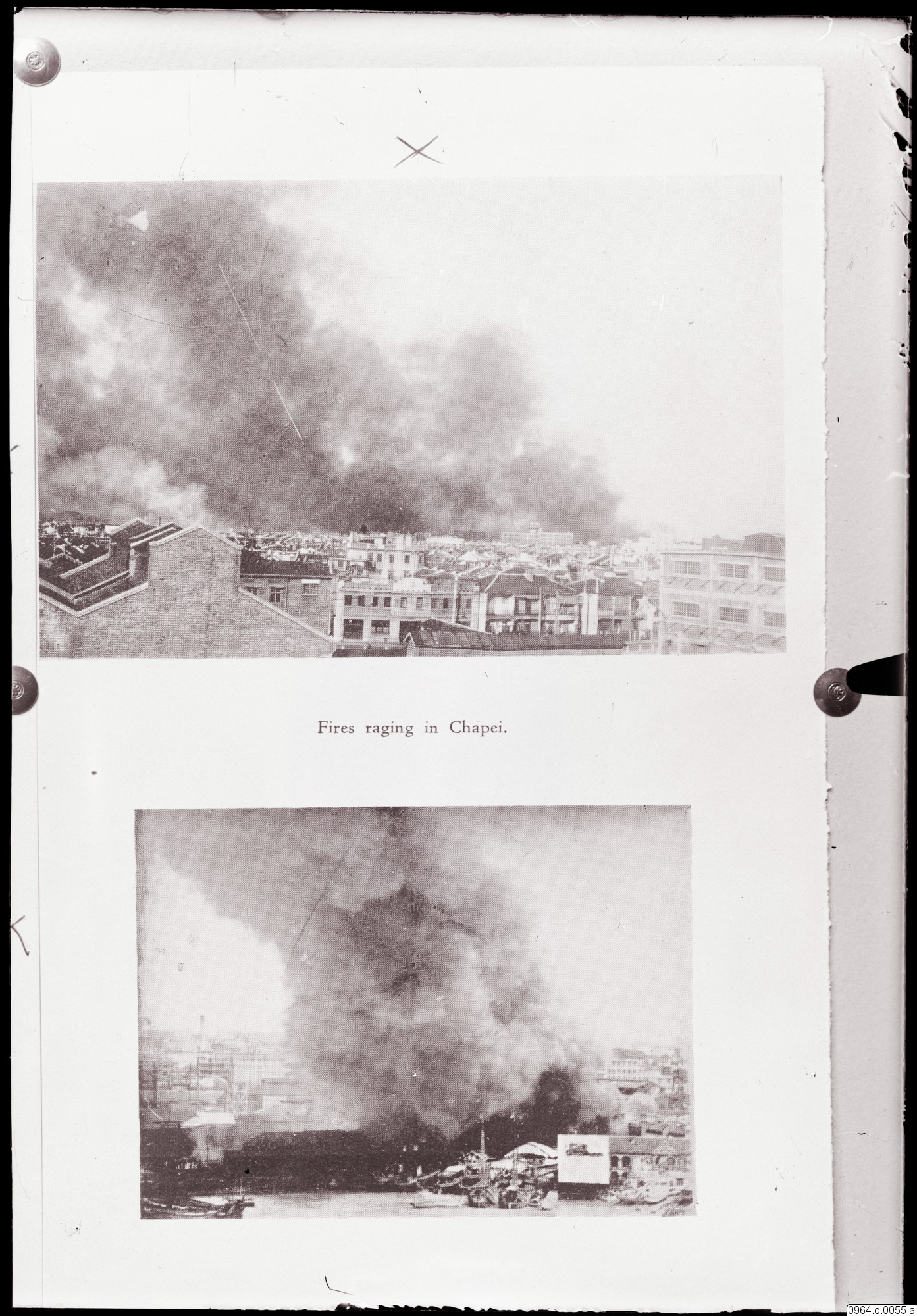 • Från missionsfälten, brand rasar i Chapei. Bild av den brinnande stadsdelen.