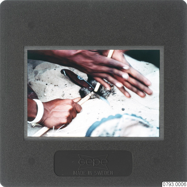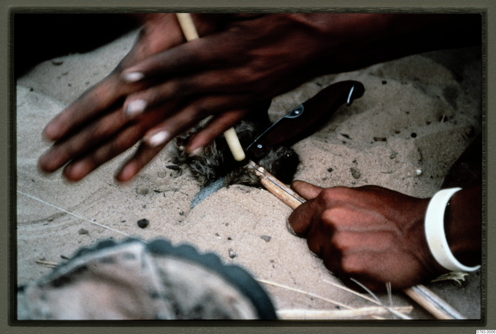 • Göra upp eld, Xade. Den undre pinnen ska vara av ett något mjukare trädslag. Den vilar mot en kniv för stöd i sanden. Notera armbandet, tillverkat av en plastbehållare.