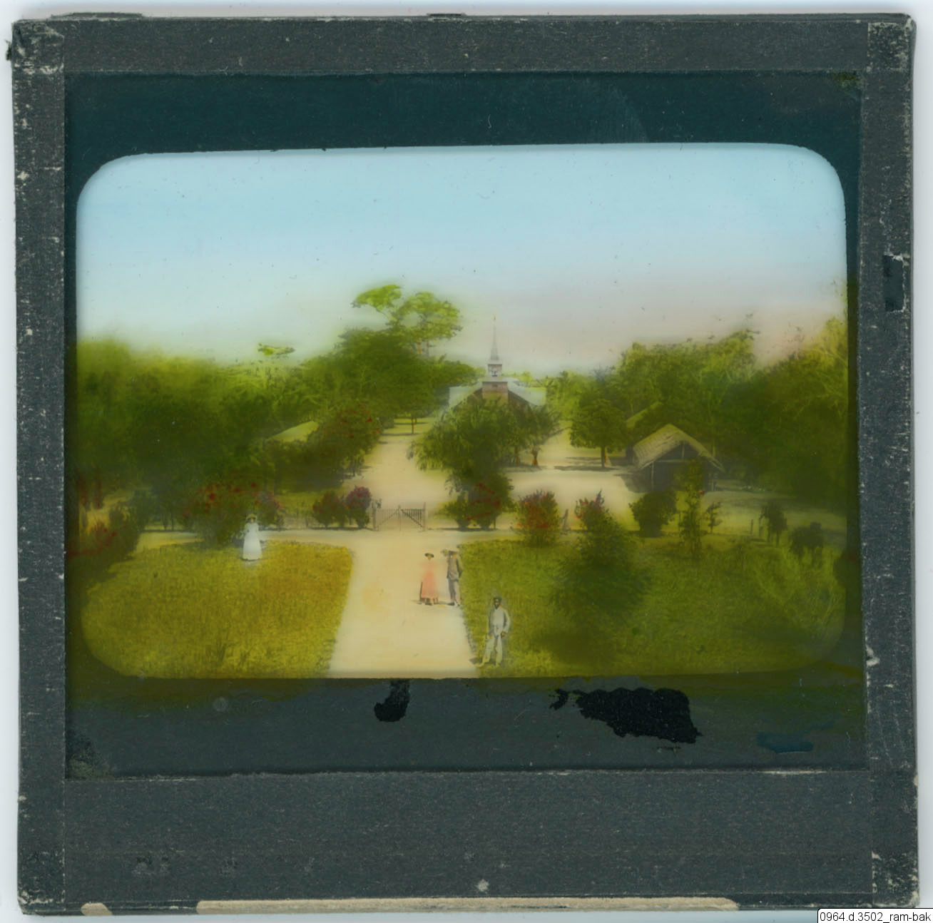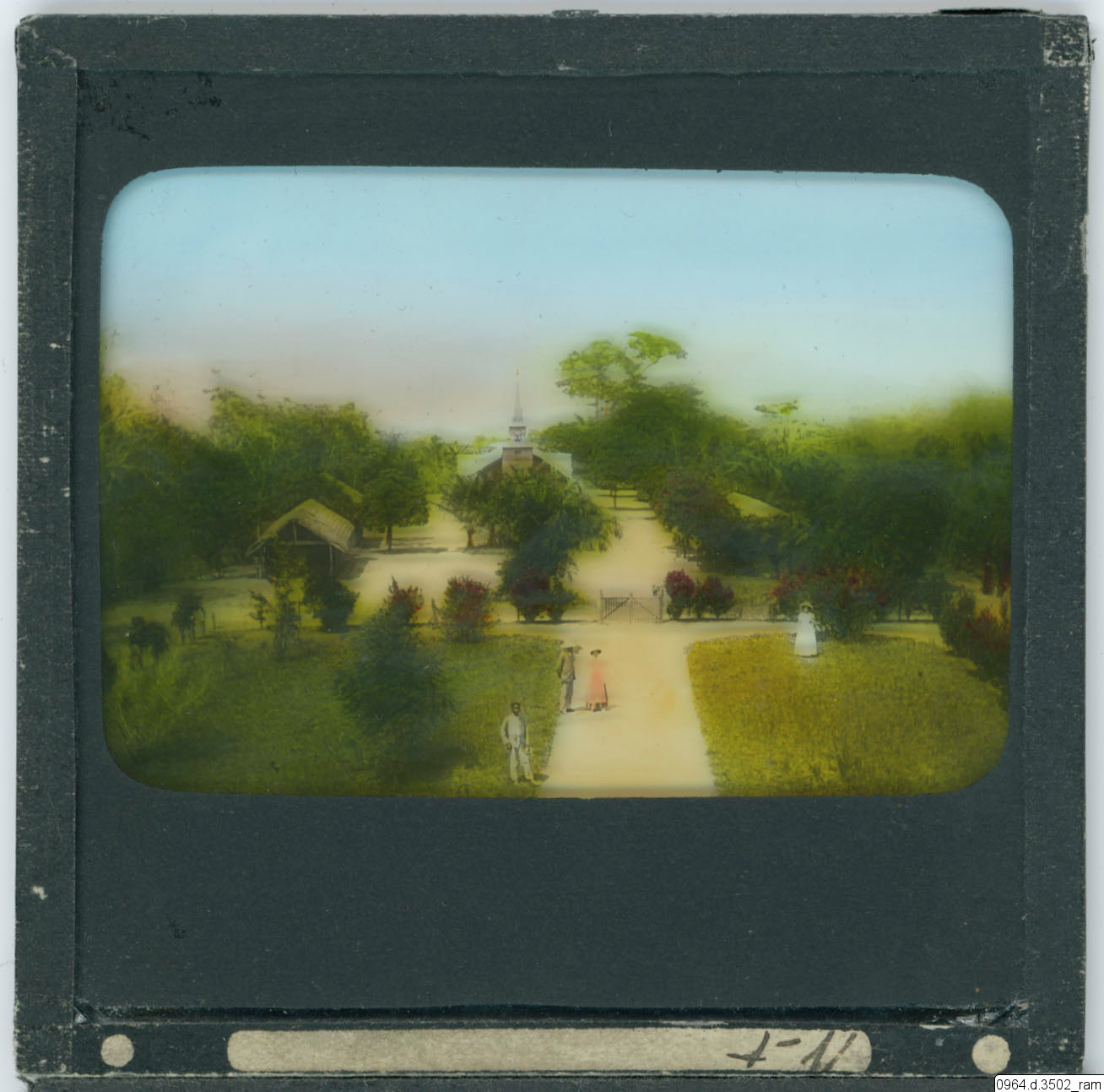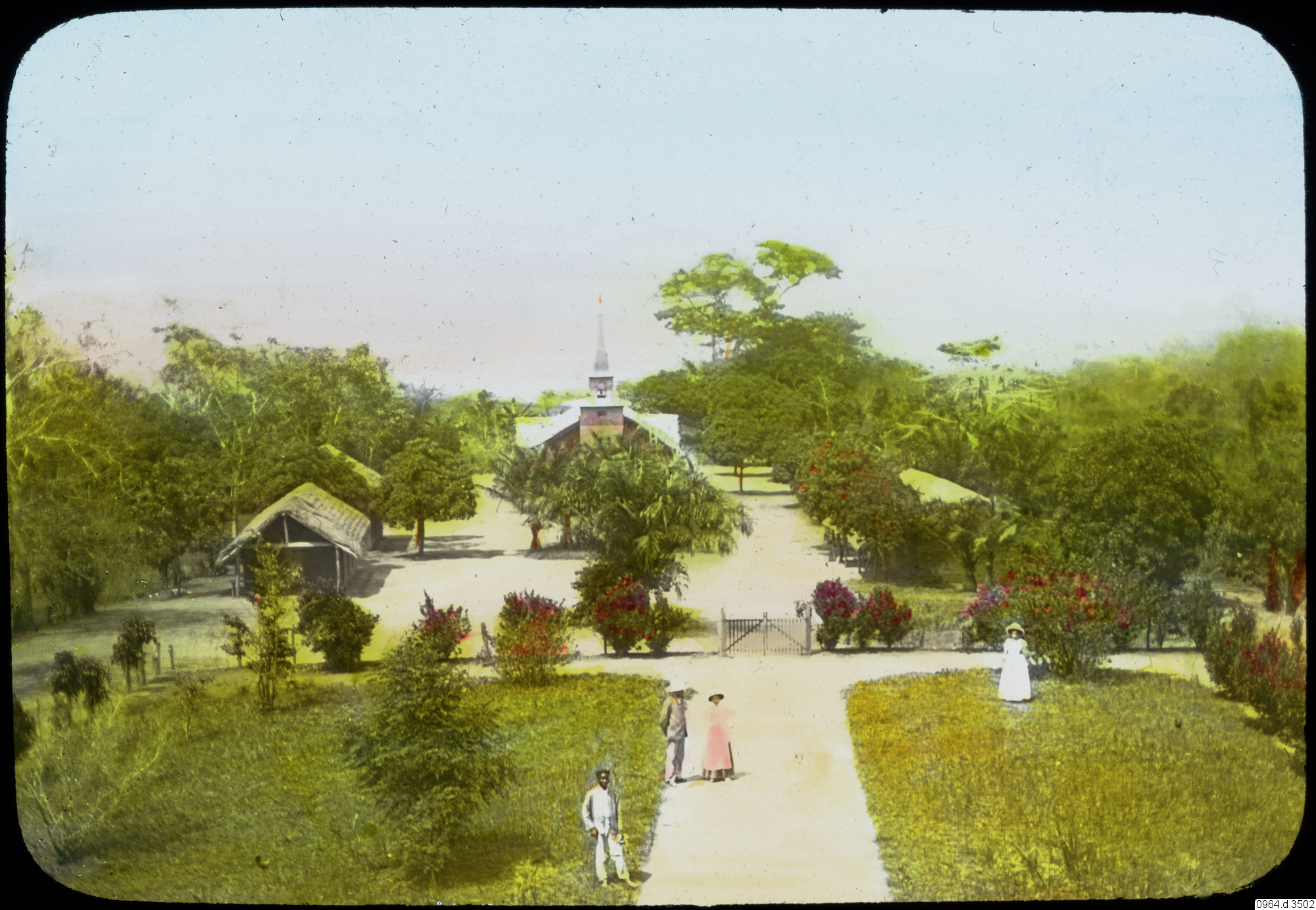 missionsstation, trädgård, grind, palmer, missionärer, kyrka, fotografi, photograph