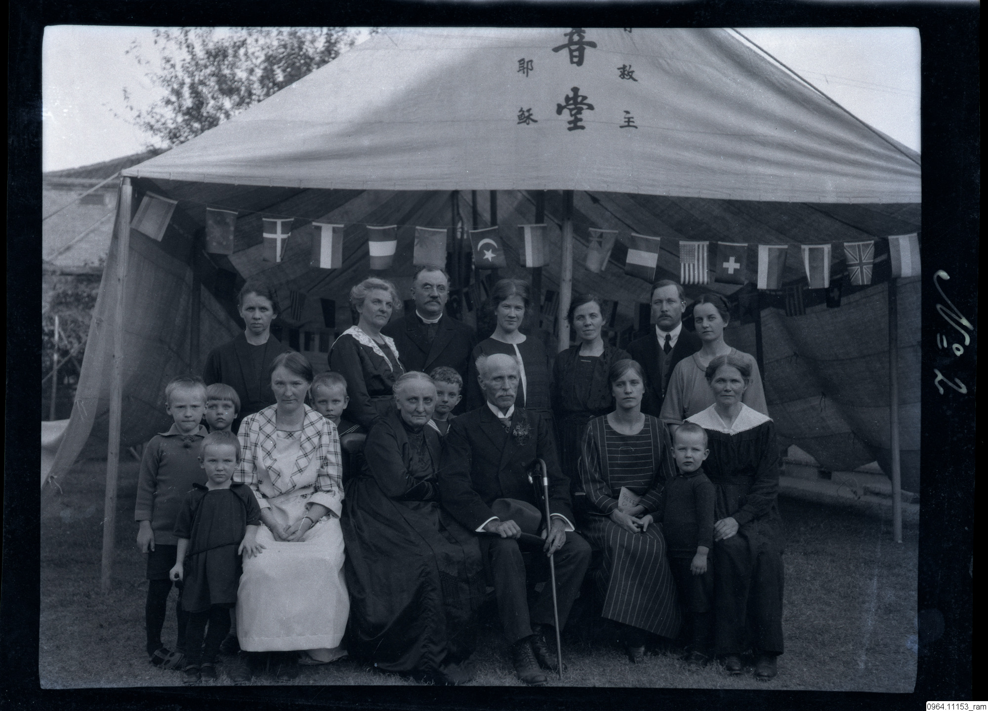 Gruppbild med vuxna och barn i ett tält med kinesiska tecken. Rad 1: 1? 2 Kullberg Paulina och Nils. 3 4 5 6. Missionärer i Kina se i Biografiskt album för Svenska Missionsförbundet. 1928. GUB0128663.pdf