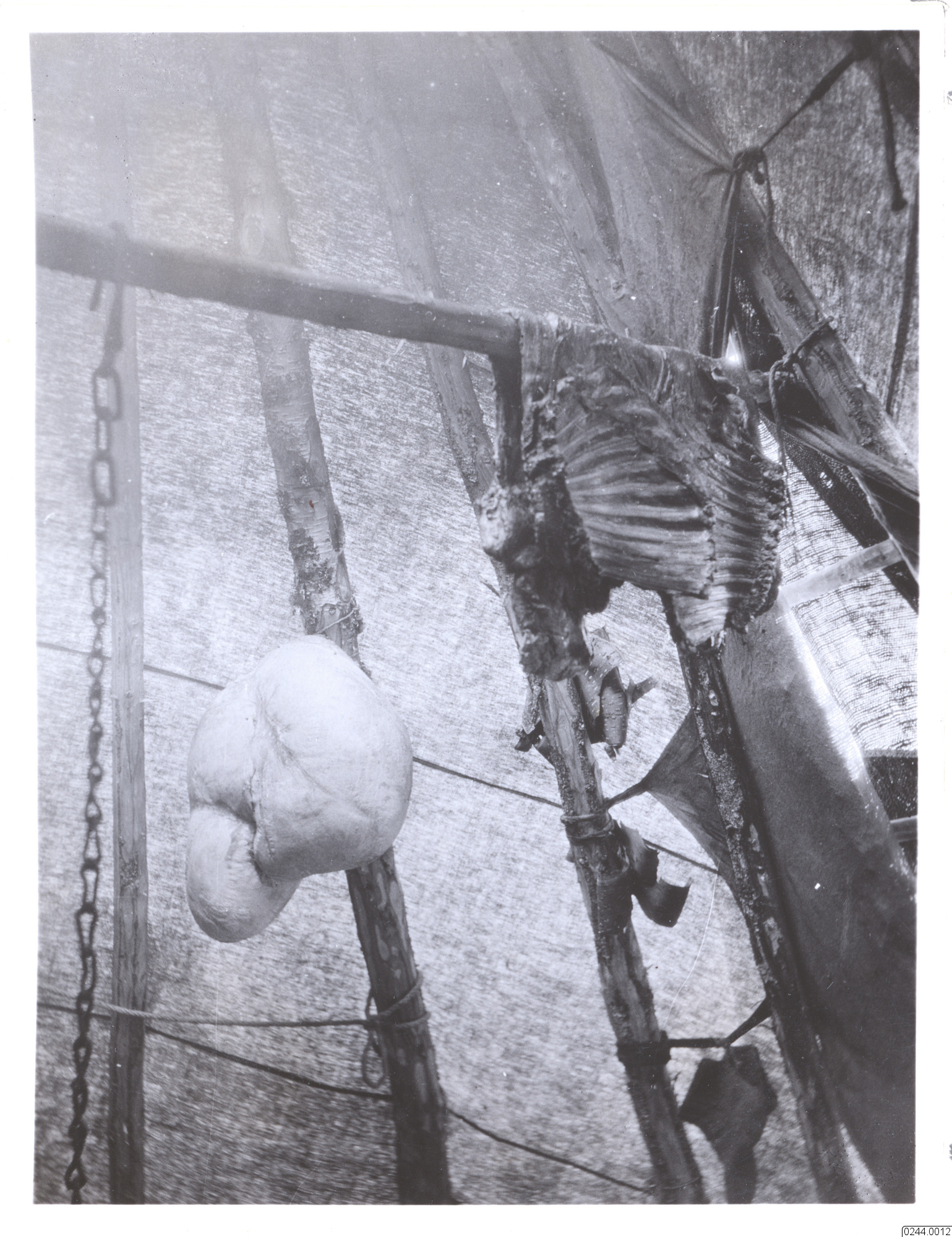 • Seväs kåta: interiör; suovva-muorras fäste vid uksa. Vittankgi skogslappby. Tuolpukka. Teukkajärvi.