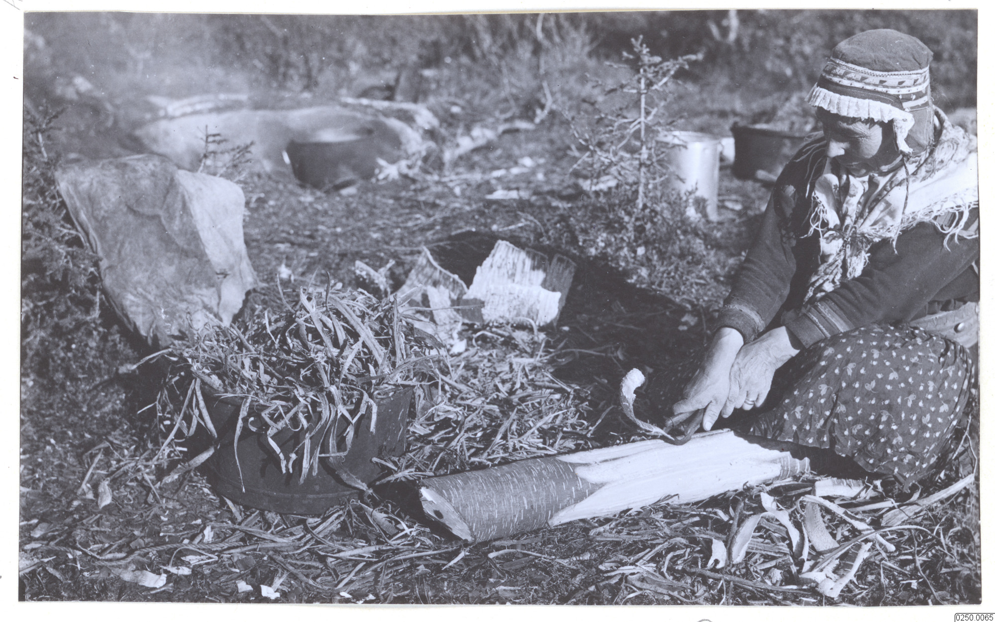 • Garvning: björkbark skäres; t.v. barkkittel. (E.V.) Vittangi skogslappby. Tuolpukka.