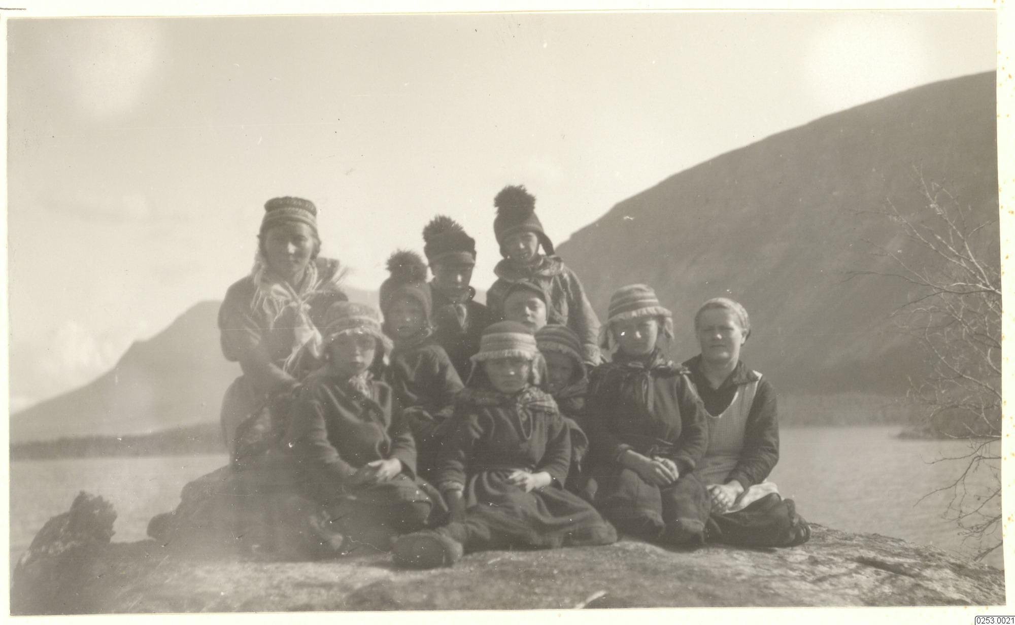 • Nomadskolan; lärarinnan (t.h.), barnen o. husmodern. Vaisaluokta. Jokkmokk s:n.