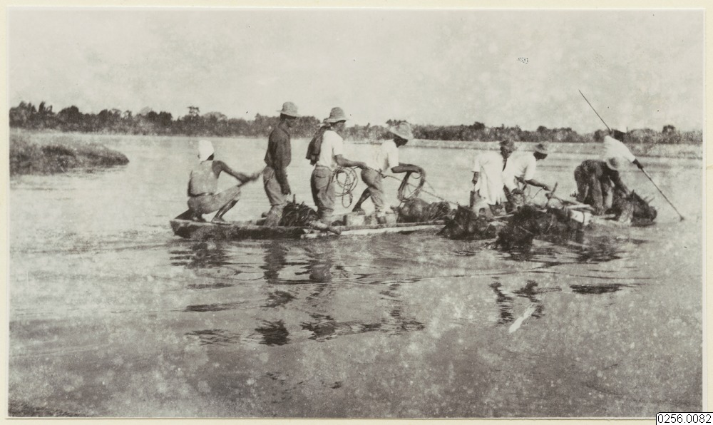 • Män i kanot med simmande ponnyhästar korsar en flod.