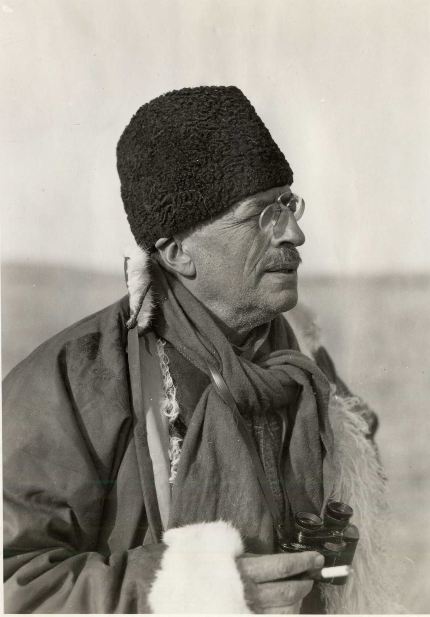 Sven Hedin med mössa, cigarett, kikare (liknar föremål 1952.50.0525 men är inte den) och glasögon. Från Sven Hedins bilexpedition 1933-35. Sven Hedin vid Unien ussu 6/12 1933. Foto Hummel