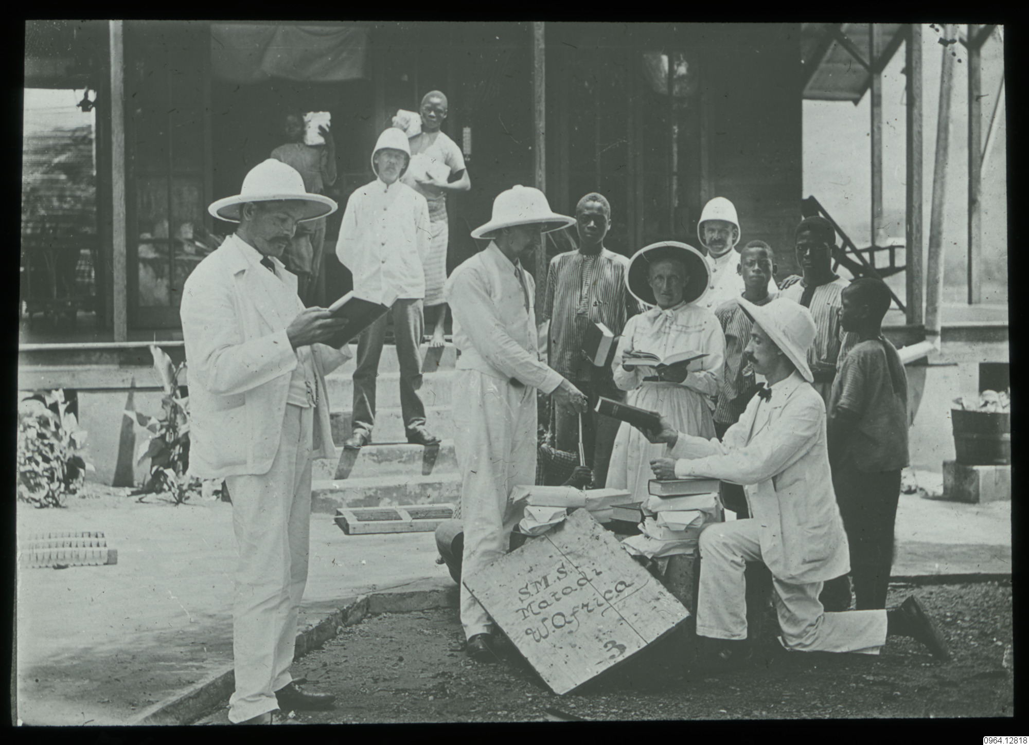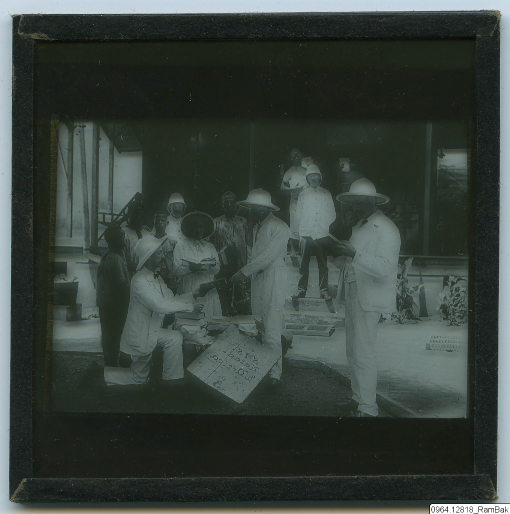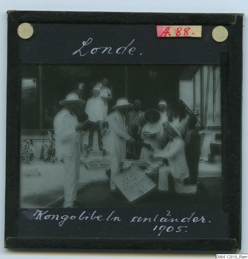 Första lådan med helbiblarna (Kongobiblarna) på kikongo (kifioti) kommer till Londe, 3 april 1905. Lembke C.W., lots och sjökapten Westerhult Uno, Westling Martin, Andersson Augusta, Westlind P.A., Grahn C.W. Sv. Veck. nr 35/1955.