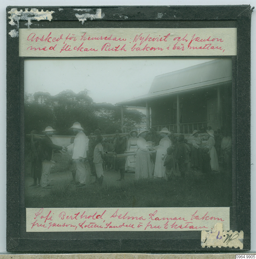 Farväl för avfärd till konferens. Fr v: Westlind P.A., Jansson August o Hanna, Fält Elisabeth, Laman Selma, ?, ?