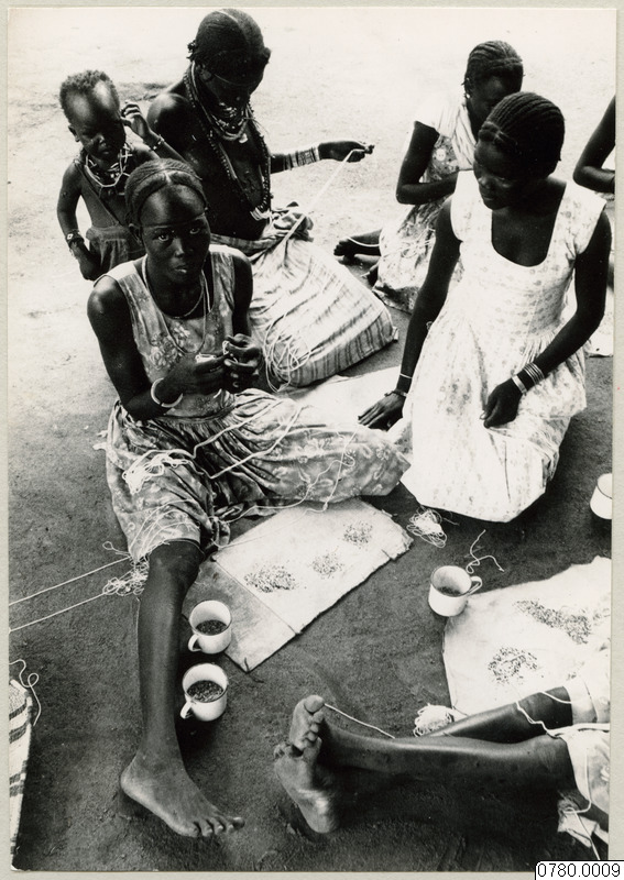 • Kvinnor som tillverkar armband och bälten i pärlor. Jfr. 1981.3.27. Gambela, Etiopien. Foto Tony Håkansson ca 1965-70.