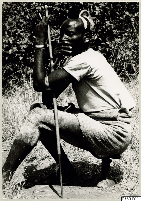 • Hammar-man sitter på nackstöd / pall. Sydvästra Etiopien. Foto Tony Håkansson ca 1965-70.