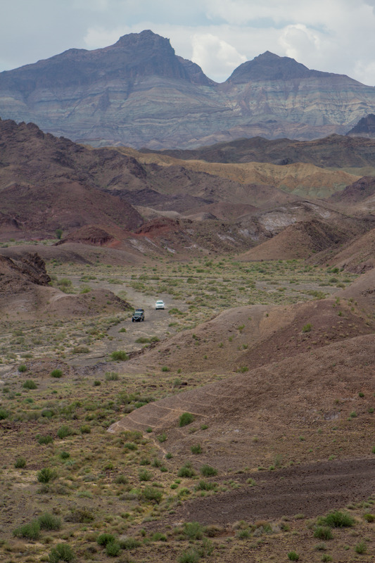 • Våra bilar återvänder efter en exkursion mot bergen i sydväst från läger 3.