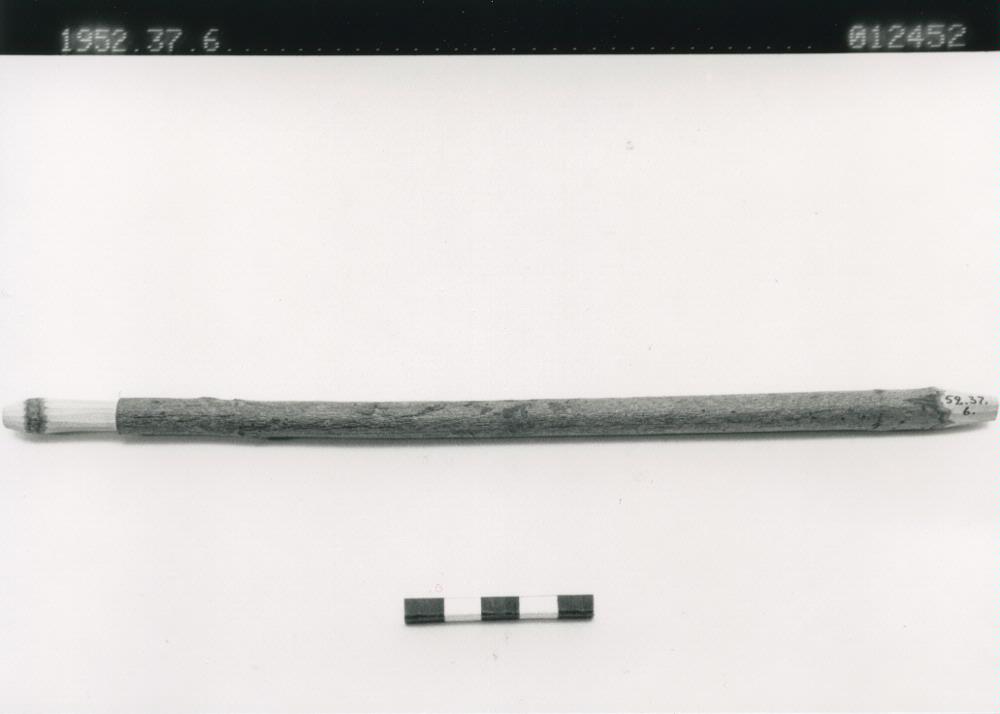 Skaft av svarvat trä till haschischpipa. Tillhörande piphuvud finns bland nummer 7-12 i samlingen (1952.37). Sebsi (marockansk-arabiska = pipa) användes för att röka kif (obehandlad haschisch) blandat med tobak. Denna drog framkallar en känsla av välbefinnande. Tillåtet att odla Kif i Marocko för husbehov och egen konsumtion. Staten odlar för försäljning, främst i norra Marocko. Litteratur: Rausch und Realität. Drogen in Kulturvergleich. Hrsq von Gisela Völger 2 vol. Ethnologica. N.F.Bd 9, 1981 in Auftrag der Gesellschaft für Völkerkunde. Köln (i FME bibliotek). Bellakhdar, Jamal, cop. 1982: Herb Drugs and Herbalists in the Maghreb. Venzloft, Helga, 1977: Der marokkanische Drogenhändler und Seine Ware.