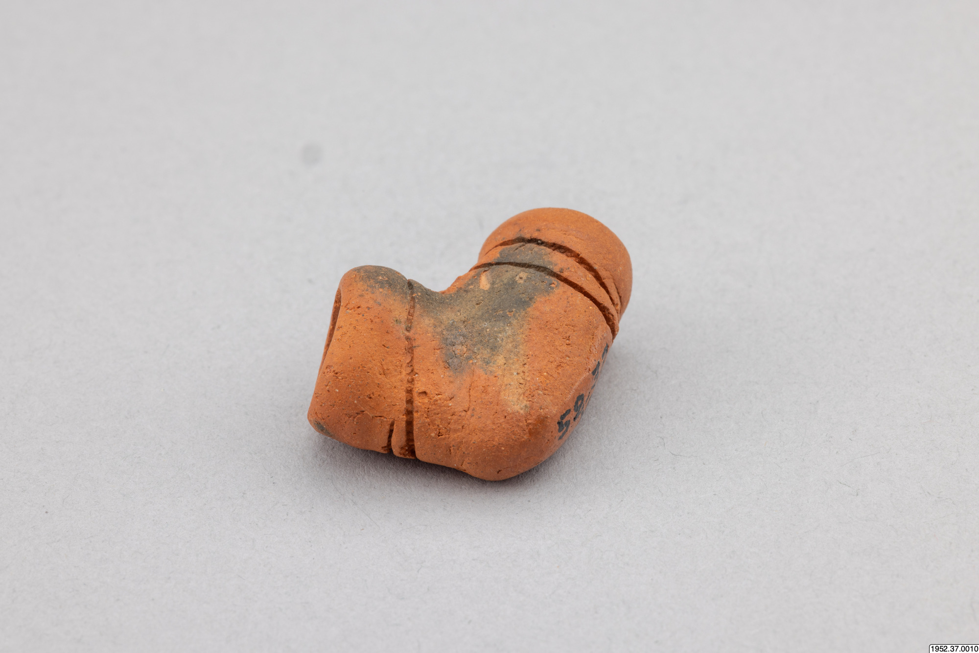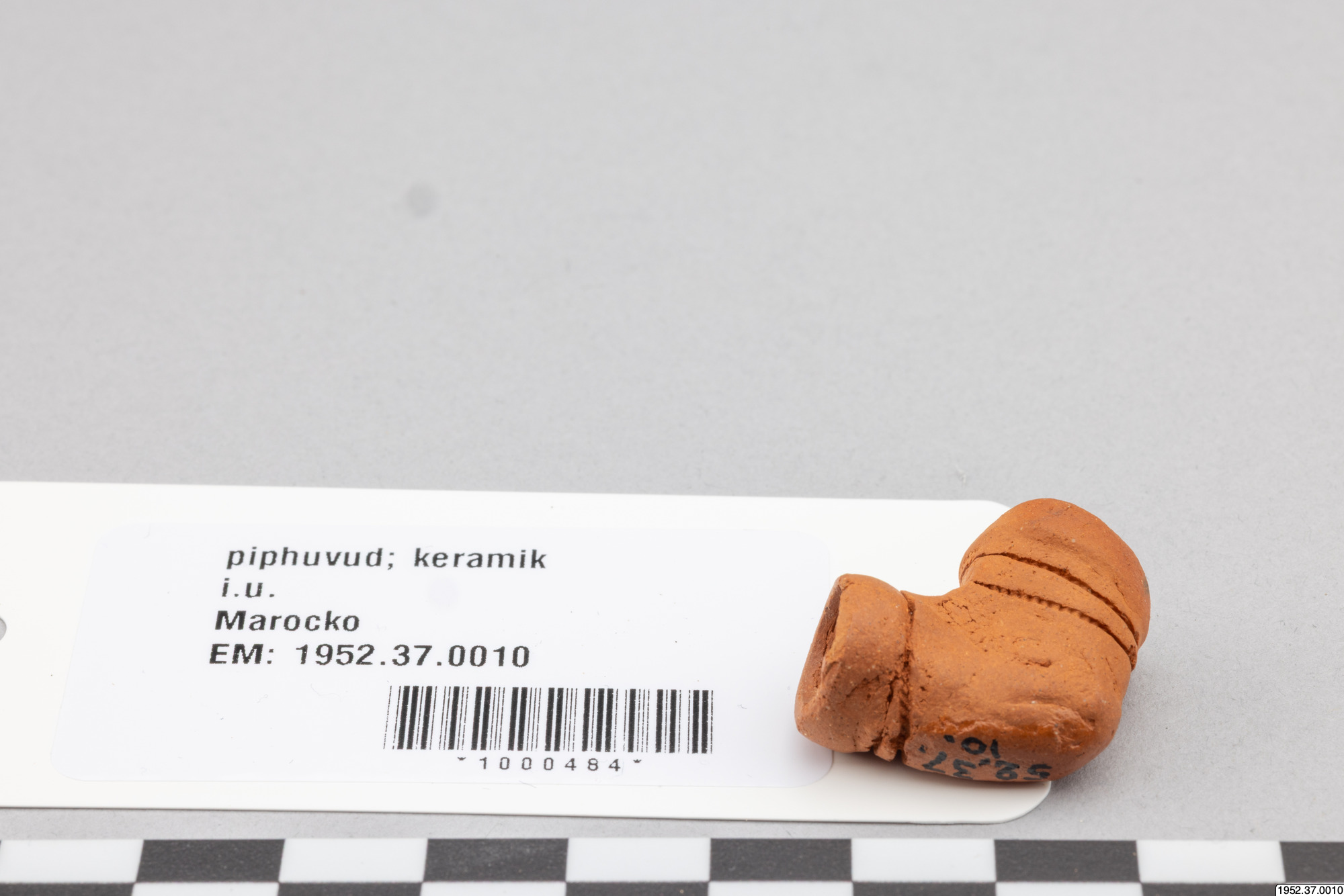 Piphuvud av röd, bränd, lera. Löstagbart. Tillhörande pipskaft finns bland nr 1-6 i samma samling (1952.37). Användes vid haschischrökning. Sebsi (marockansk-arabiska = pipa) användes för att röka kif (obehandlad haschisch) blandat med tobak. Denna drog framkallar en känsla av välbefinnande. Tillåtet att odla Kif i Marocko för husbehov och egen konsumtion. Staten odlar för försäljning, främst i norra Marocko. Litteratur: Rausch und Realität. Drogen in Kulturvergleich. Hrsq von Gisela Völger 2 vol. Ethnologica. N.F.Bd 9, 1981 in Auftrag der Gesellschaft für Völkerkunde. Köln (i FME bibliotek). Bellakhdar, Jamal, cop. 1982: Herb Drugs and Herbalists in the Maghreb. Venzloft, Helga, 1977: Der marokkanische Drogenhändler und Seine Ware.