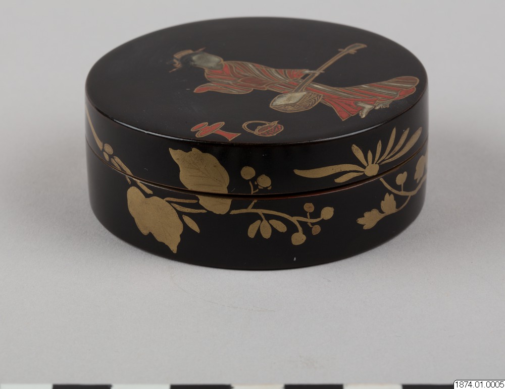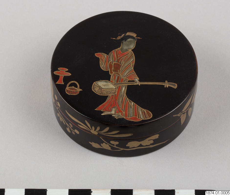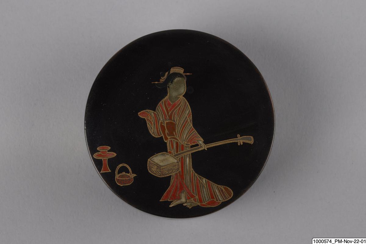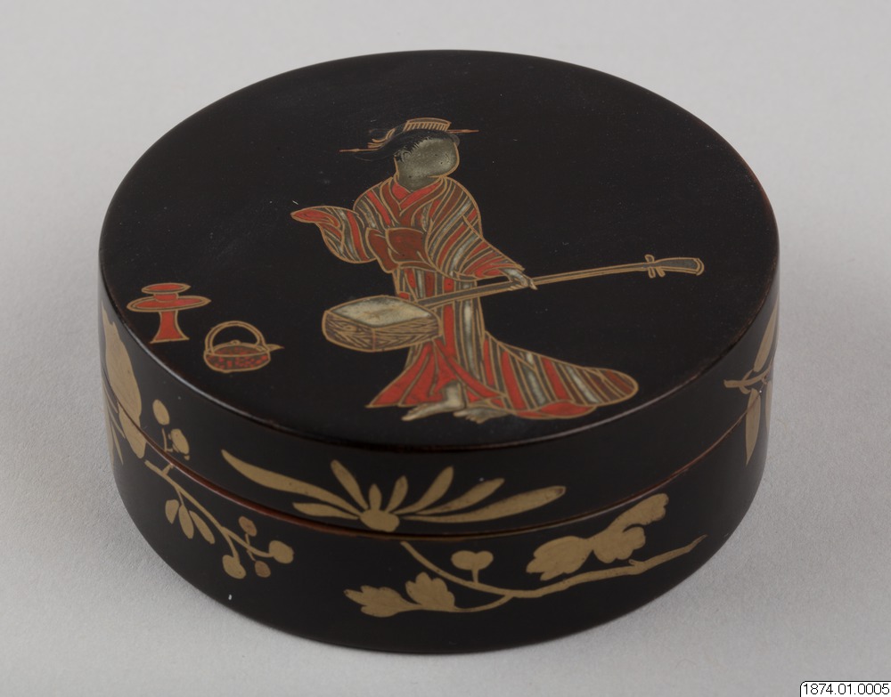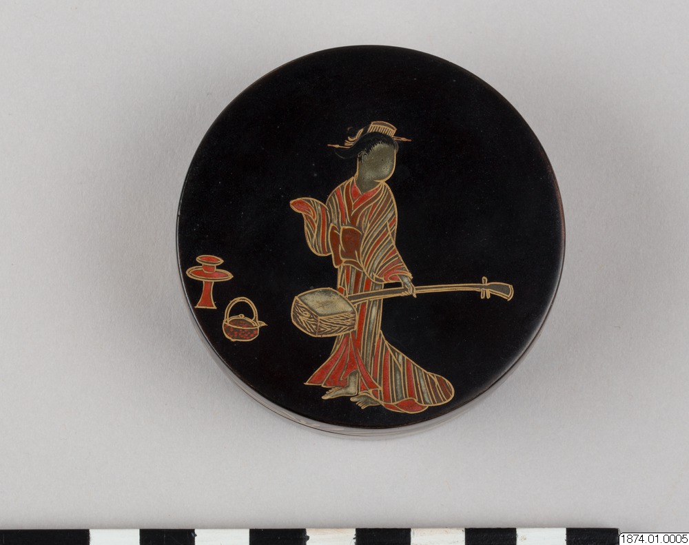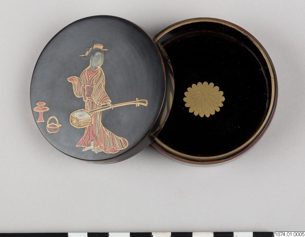 • Rökelseask (på japanska: kogo) av trä med blanksvart lackgrund av typen ro-iro, dekor i tekniken hiramaki-e, togodashi maki-e och röda lackdetaljer. Dekoren visar en dam iklädd randig kimono med en shamisen (tresträngat musikinstrument), en kanna samt krysantemumblommor runtom asken och inuti. Sannolikt en geisha. Avbildningen av kvinnan visar tydliga likheter med motivkretsen "bijin-ga" (vackra m... Visa hela