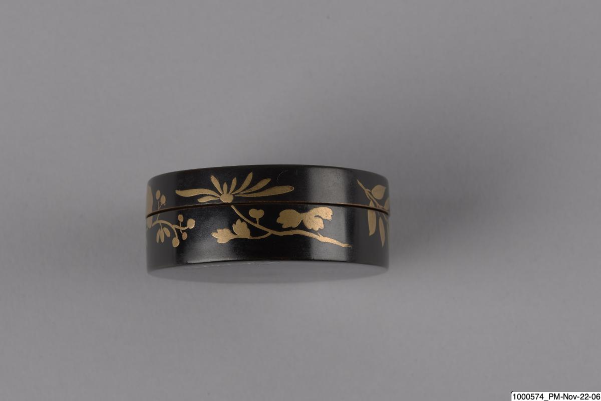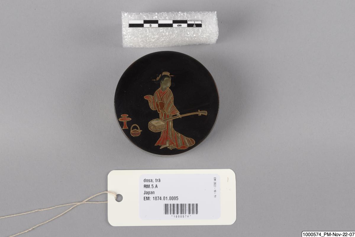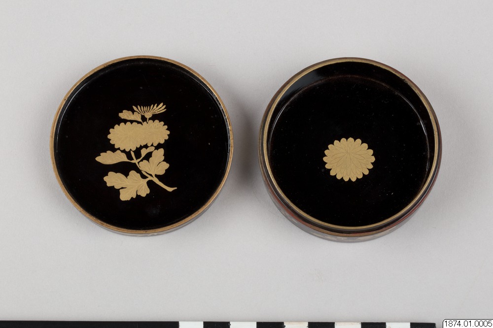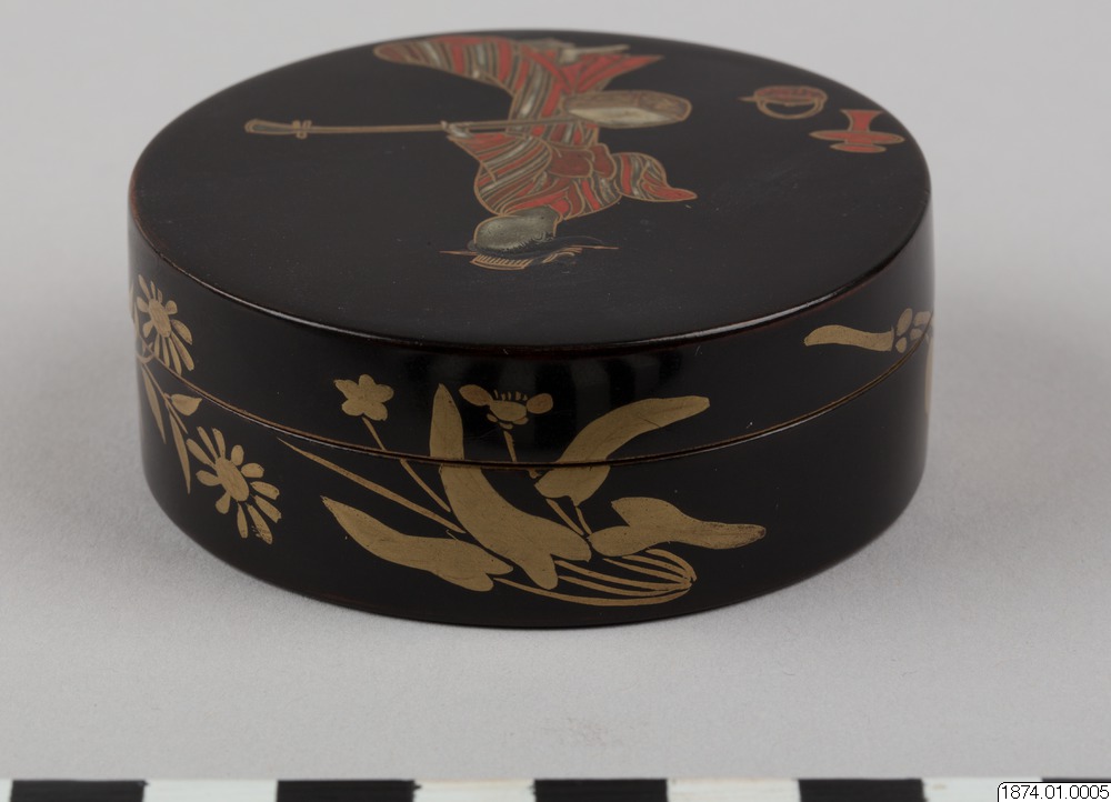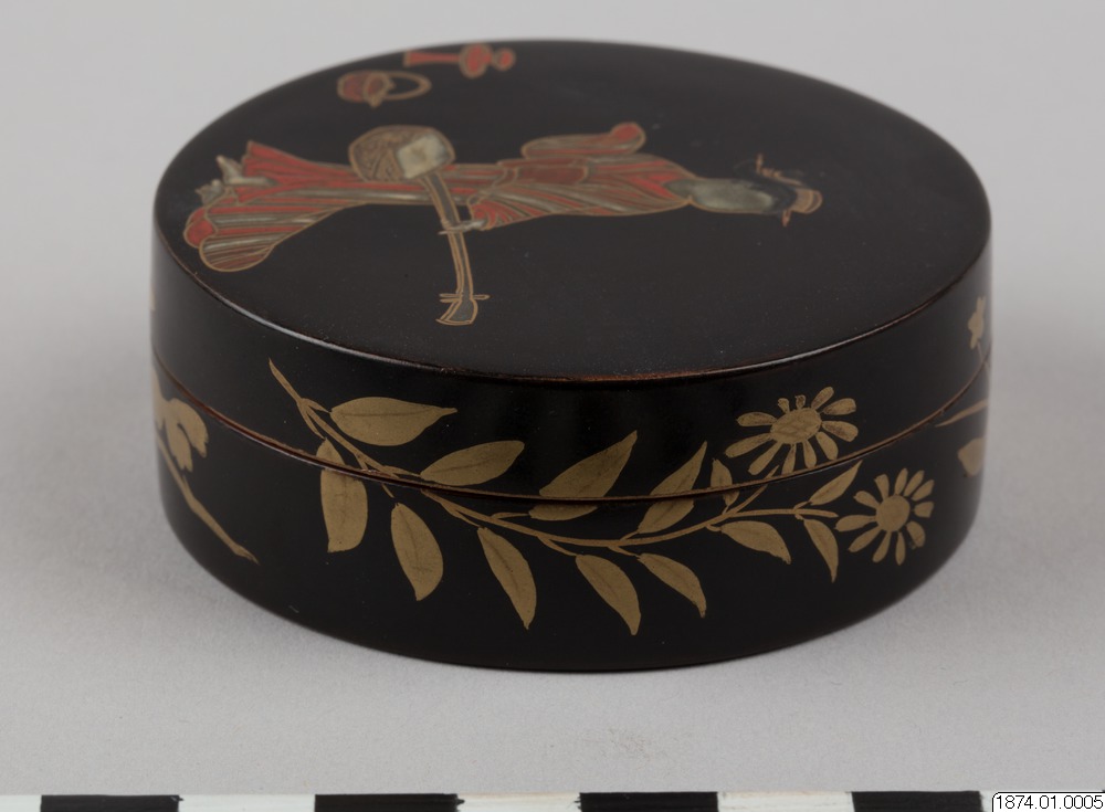 • Rökelseask (på japanska: kogo) av trä med blanksvart lackgrund av typen ro-iro, dekor i tekniken hiramaki-e, togodashi maki-e och röda lackdetaljer. Dekoren visar en dam iklädd randig kimono med en shamisen (tresträngat musikinstrument), en kanna samt krysantemumblommor runtom asken och inuti. Sannolikt en geisha. Avbildningen av kvinnan visar tydliga likheter med motivkretsen "bijin-ga" (vackra m... Visa hela