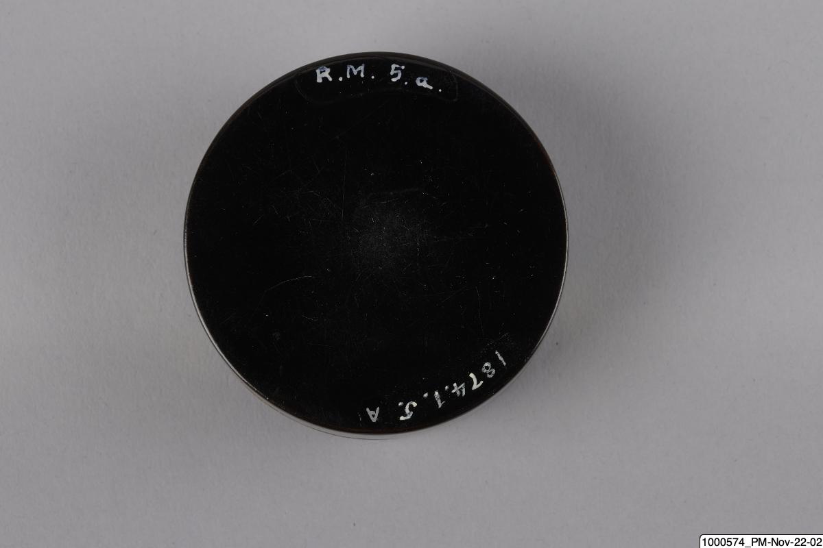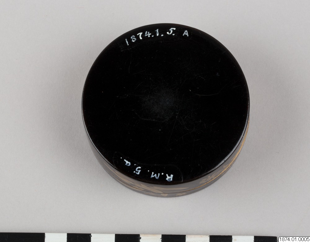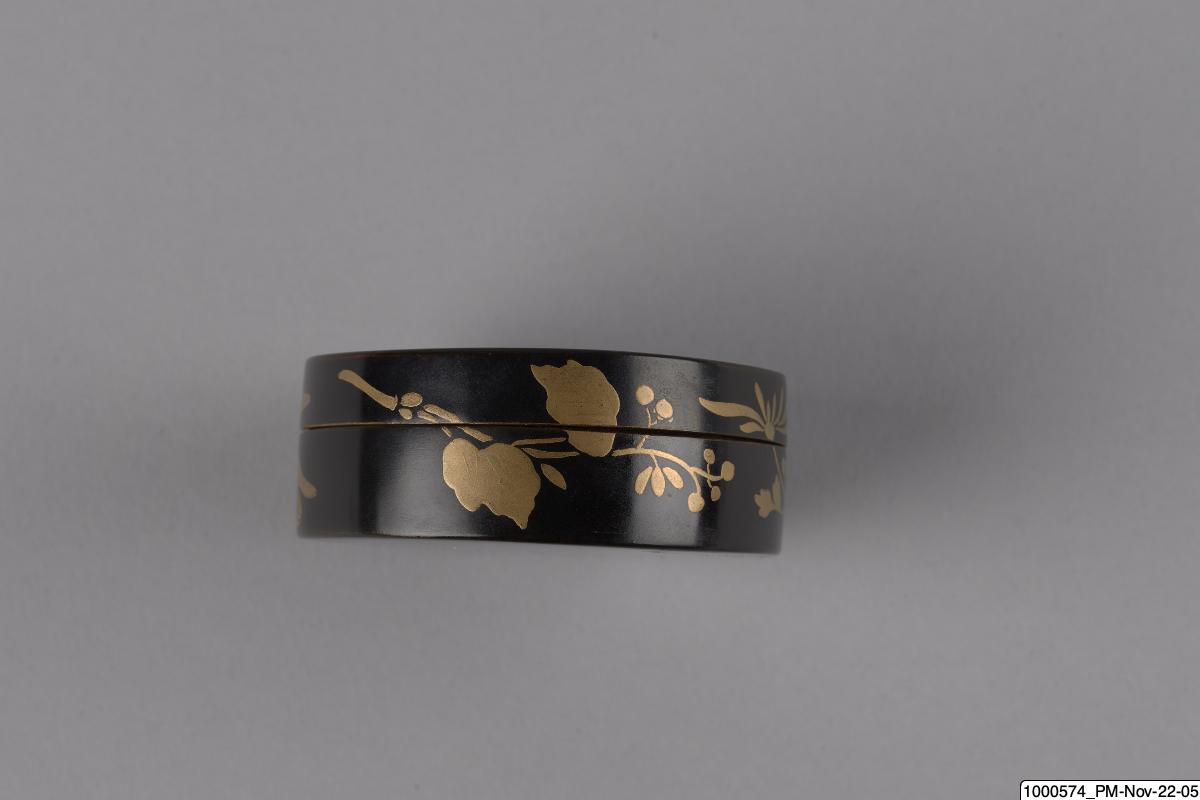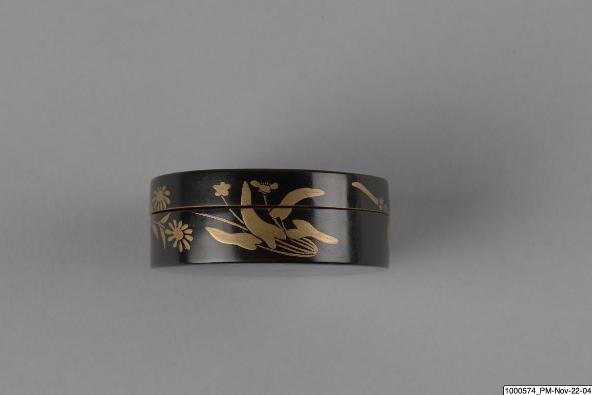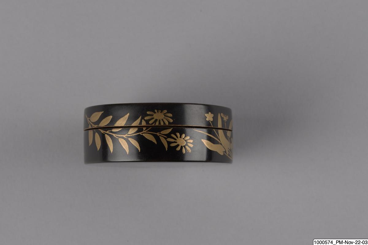 • Rökelseask (på japanska: kogo) av trä med blanksvart lackgrund av typen ro-iro, dekor i tekniken hiramaki-e, togodashi maki-e och röda lackdetaljer. Dekoren visar en dam iklädd randig kimono med en shamisen (tresträngat musikinstrument), en kanna samt krysantemumblommor runtom asken och inuti. Sannolikt en geisha. Avbildningen av kvinnan visar tydliga likheter med motivkretsen "bijin-ga" (vackra m... Visa hela