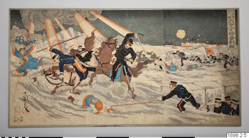 Tavla i färgtryck, uppklistrad på kartong, föreställande erövringen av Weihaiwei. Februari 1895. (generalkatalogen) Träsnitt av Utagawa Kokunimasa (1874-1944).