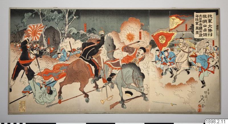 • Färgträsnitt, uppklistrad på kartong, föreställande drabbning nära Port Arthur, november 1894. (generalkatalogen)