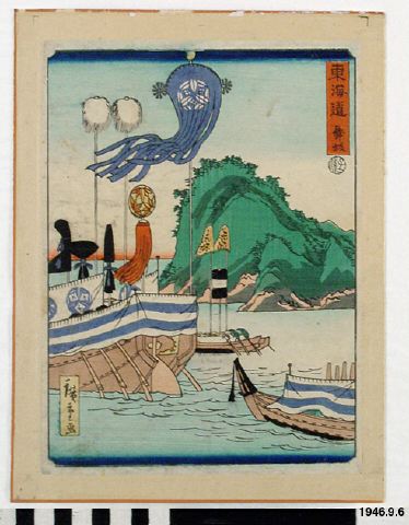 • Träsnitt av vertikalt format av Hiroshige uppklistrat på kartong med motiv av tre fartyg med olika befälstecken och vimplar med bambu-mon (troligen). Ett grönskande berg höjer sig i bakgrunden. En textpanel i övre högra hörnet samt en med signatur i nedre vänstra och en stämpel under den förstnämnda panelen. Färger: blått i tre nyanser, rött, gult, grönt, brunt, svart, grått, ljusorange.