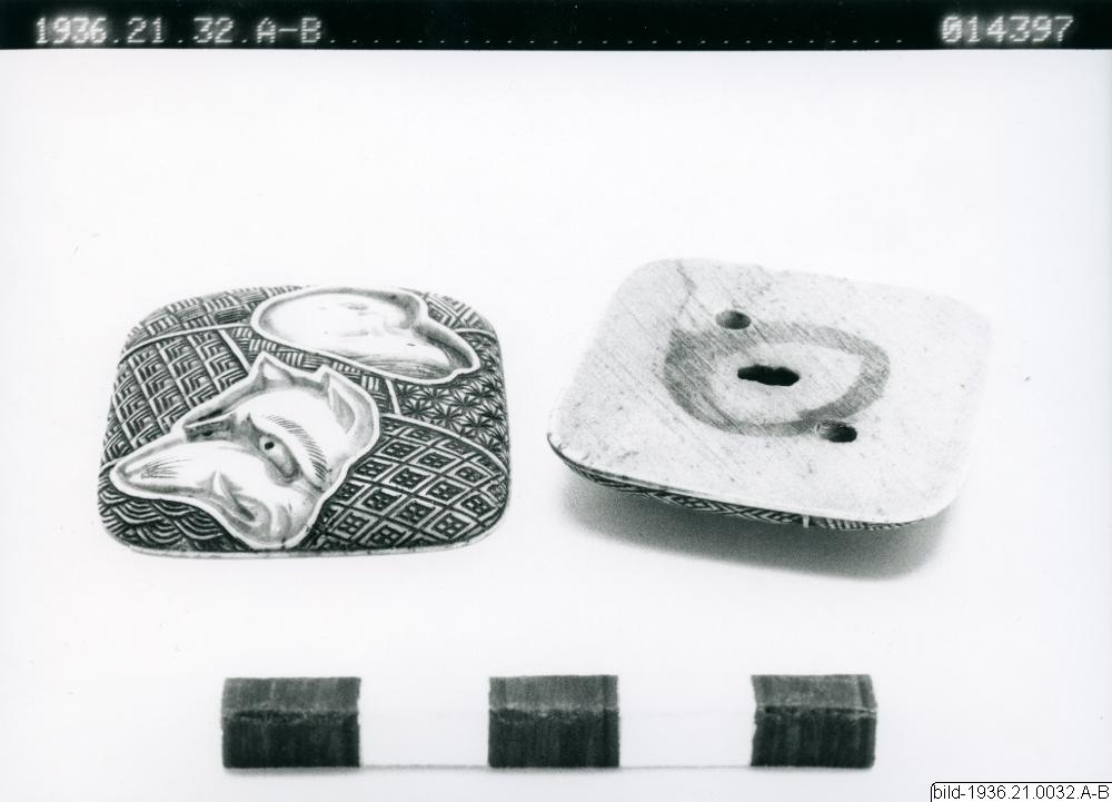 • Netsuke of manju type, rektangular, in two parts. A plate with textile patterns and two masks (possibly Okame and Kitsune). Rear side with textile patterns and a fan.