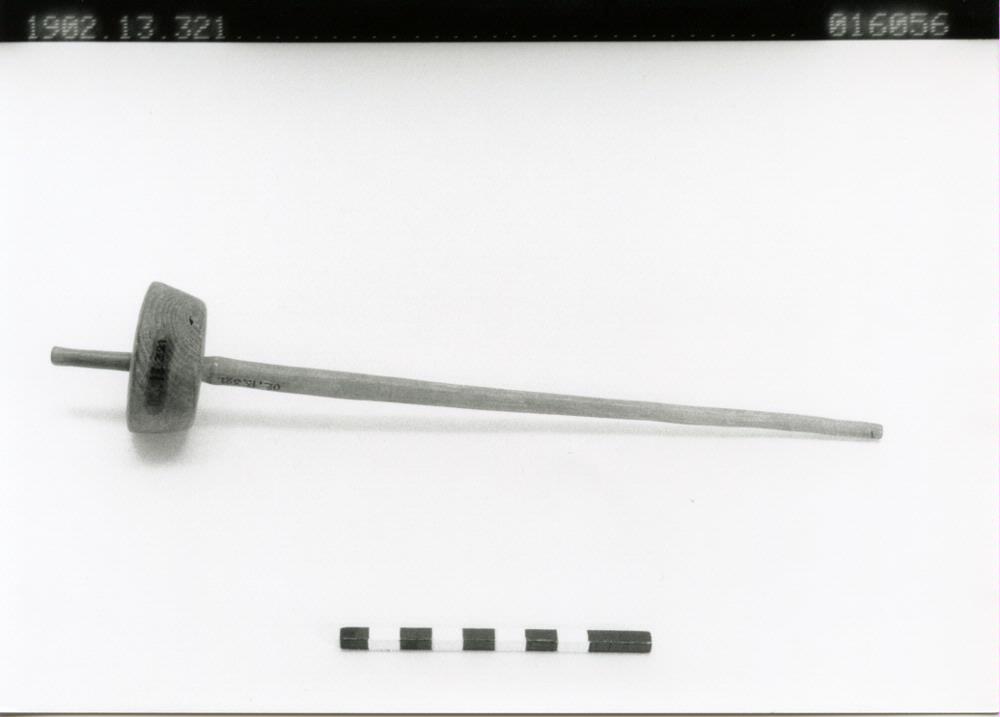 Slända av trä. Trissan är icke svarvad utan täljd med kniv ur ett mörkt, ekliknande träslag. Sländpinnen försedd med hak för tråden i övre ändan. Längd 29,8 cm. Lop-lik vid nedersta Tarim Sinkiang Kina [ocr]