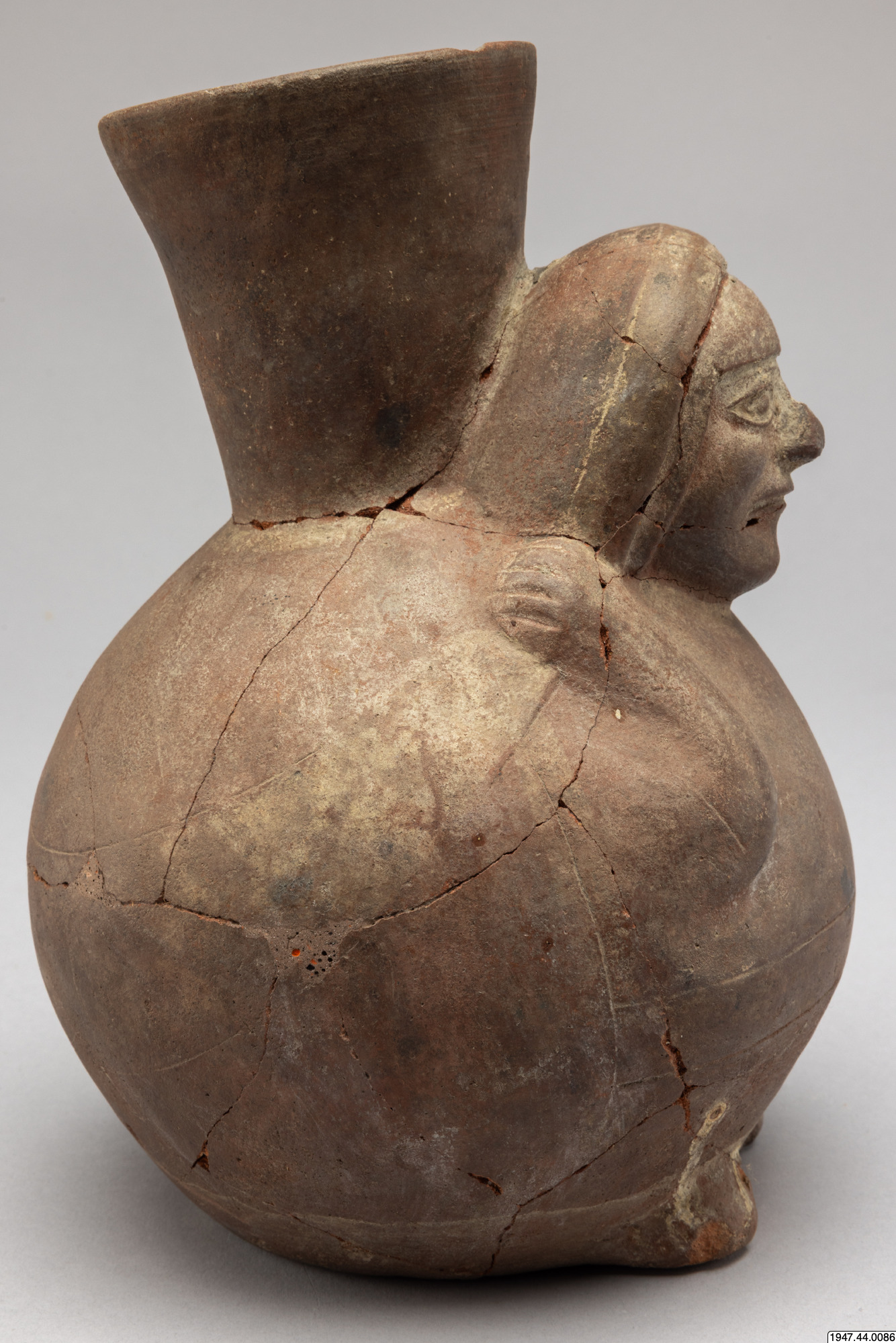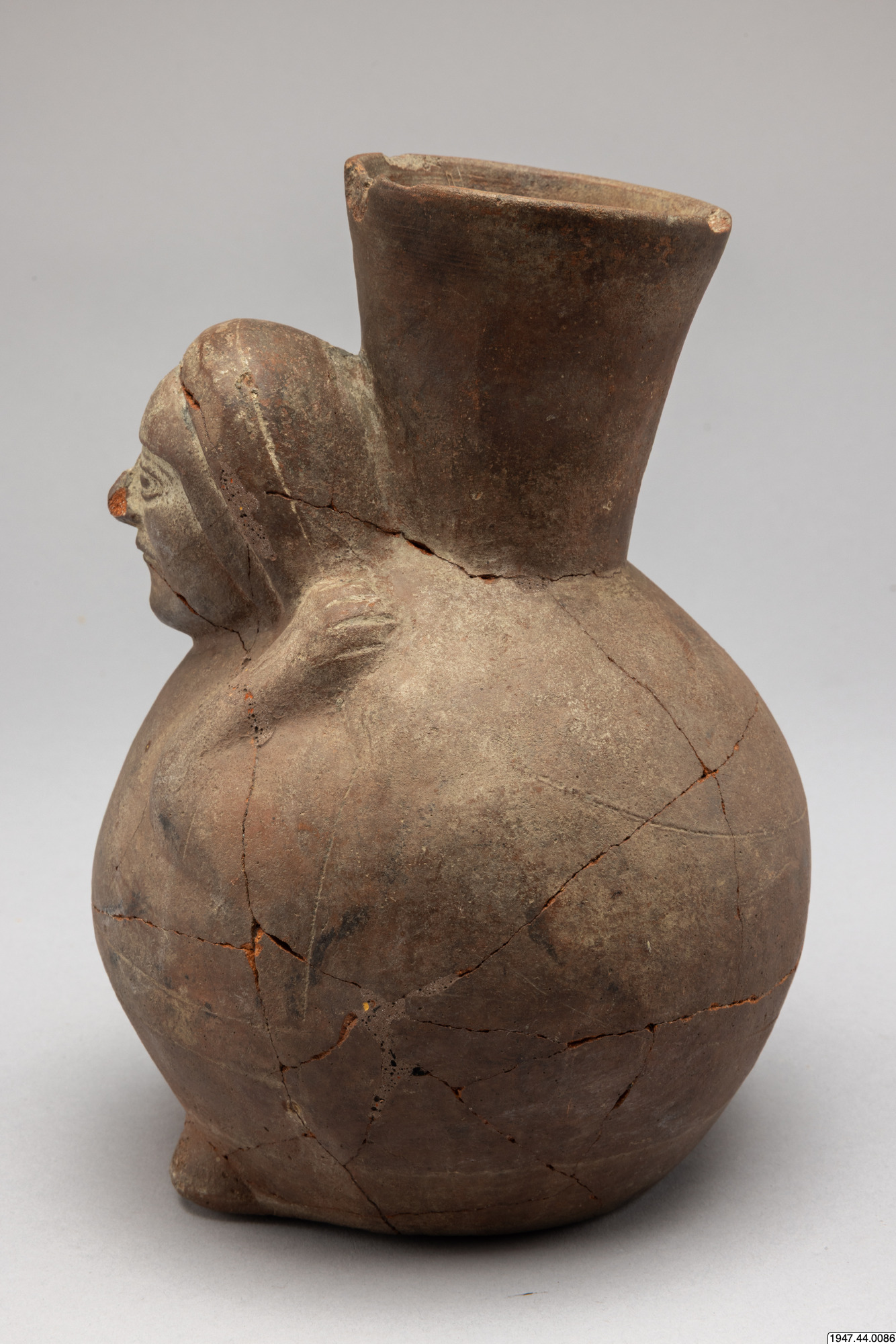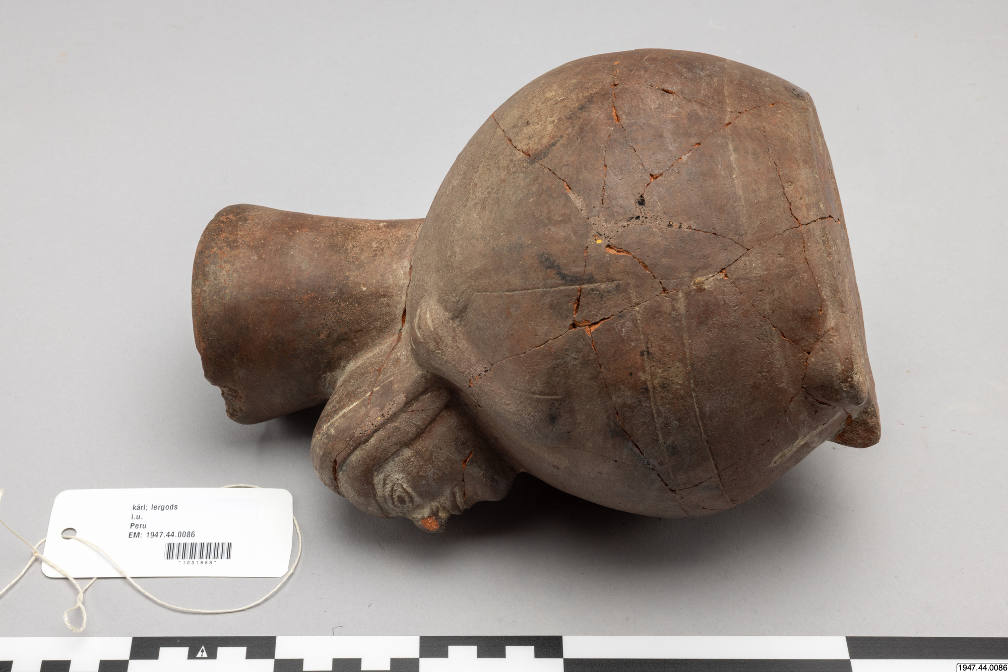 • Gravkärl av lergods. Föreställer en kvinna med en stor börda på ryggen, buren medelst pannband. Kroppen och bördan bildar det nästan globformiga kärlet medan huvudet är utfört i friskulptur. Skadat och lagat. Från norra kustlandet.