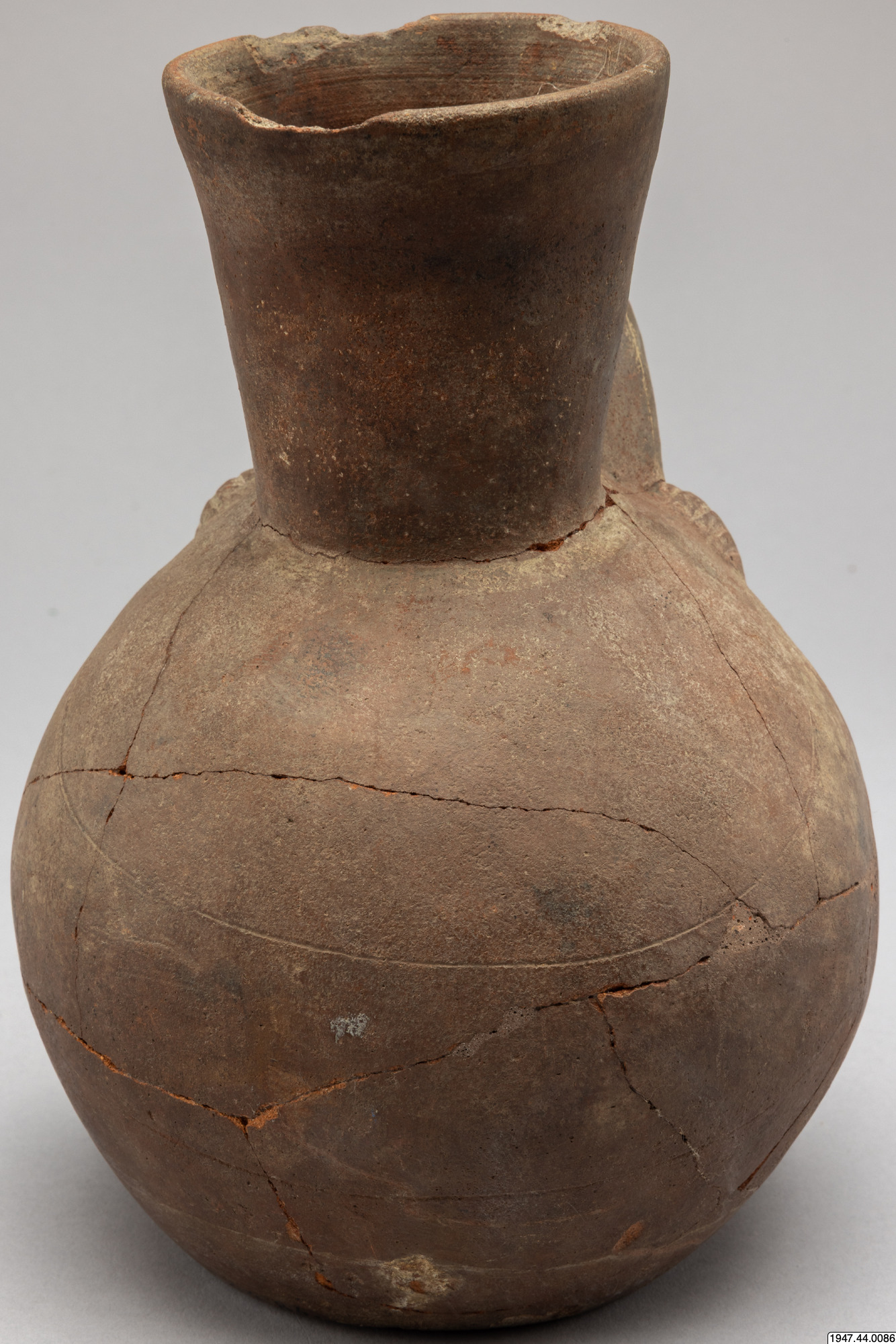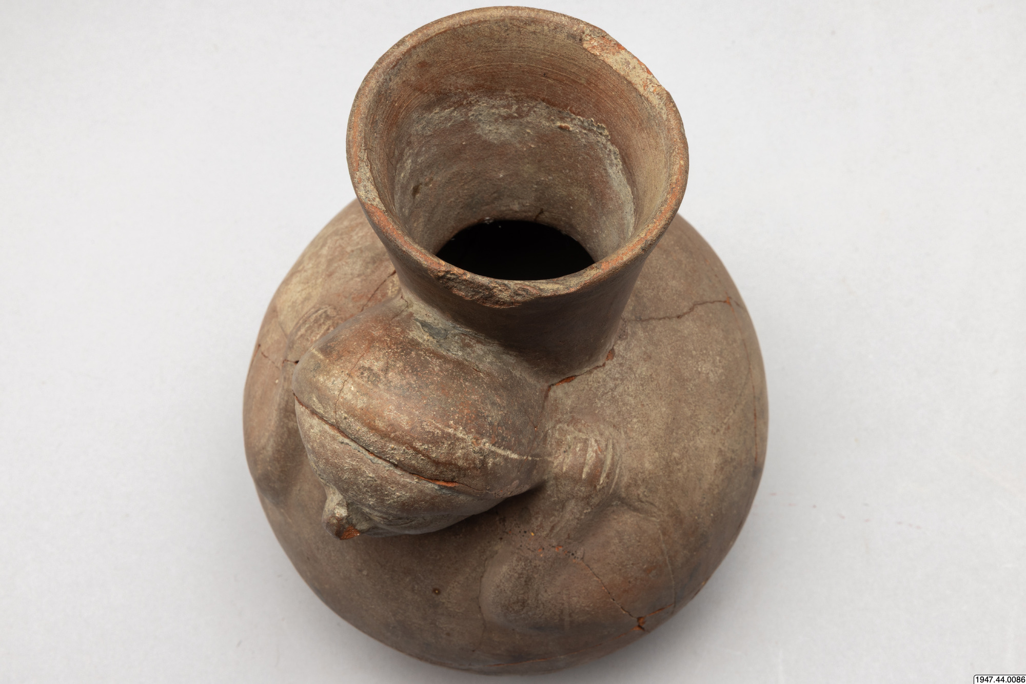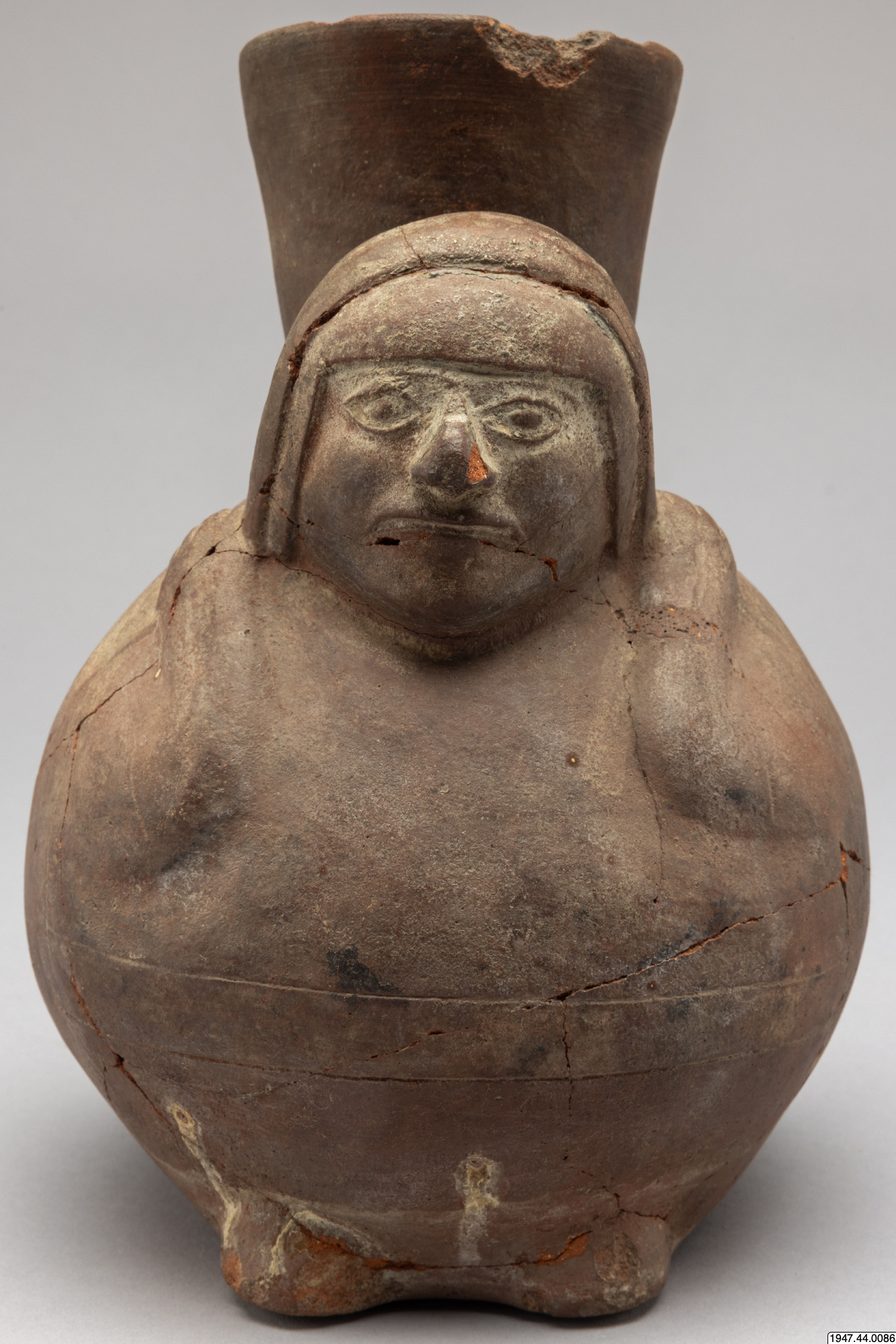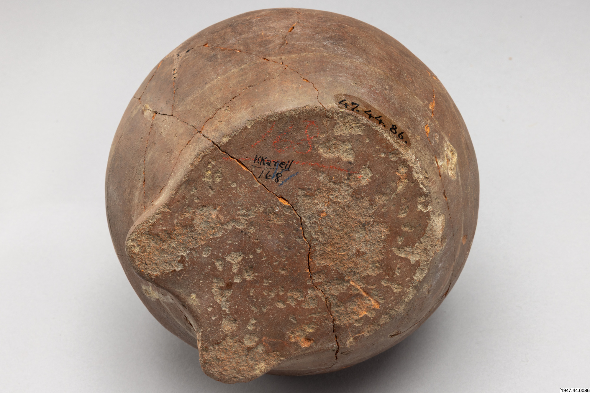 • Gravkärl av lergods. Föreställer en kvinna med en stor börda på ryggen, buren medelst pannband. Kroppen och bördan bildar det nästan globformiga kärlet medan huvudet är utfört i friskulptur. Skadat och lagat. Från norra kustlandet.