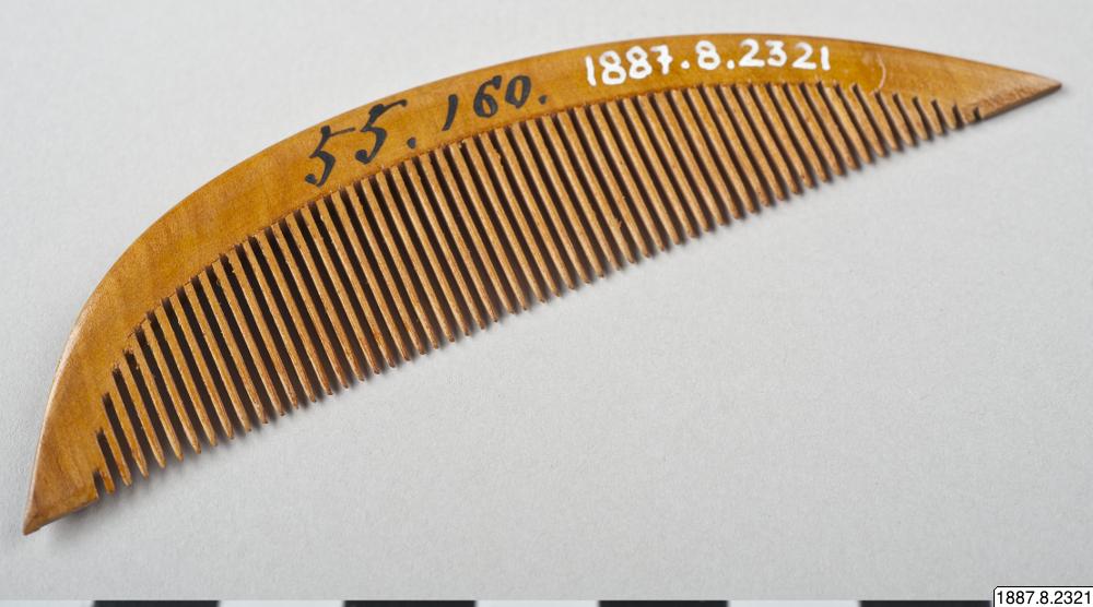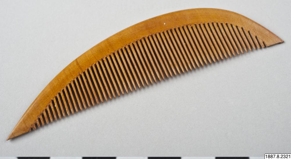 Kam av trä, lackerad. Enkel utformning. Lack: teknik och funktion Den japanska lacken kommer från lackträdet (Rhus verniciflua/vernicifera) som är släkt med mango och cashewnöt i familjen sumakväxter. Det finns flera besläktade lackträd som kan ge lack. Trädet tappas på sin sav ungefär som när man tappar gummi. Efter tappning dör trädet. Saven filtreras och är i sin flytande form eksemframkallande. Den är nästan ofärgad. Genom pigment färgas lacken, t ex svart (med järnoxid) eller röd (från kvicksilver). Lackens funktionella betydelse ligger i att den skyddar underlaget. Vanliga underlag är trä, men även metall, textil, papper och keramik. Lackeringen består ofta av ett 50-tal faser och börjar med grundning, en blandning av lack, bränt lerpulver och stenpulver. Sedan följer slipning. Själva lackeringen sker ofta i flera lager. Varje lager behöver härda i ett dammfritt skåp med ca 80% luftfuktighet. Polering är också ett viktigt moment. Tidsåtgången för ett exklusivt lackföremål kan vara upp till tio år. Vanliga dekorationstekniker är inlägg av bl a pärlemor samt pulveriserade metaller (maki-e). Lacken användes på t ex rustningar och under andra världskriget som rostförebyggare på vapen. Guldlack används även vid lagning av keramikföremål, där det icke-perfekta sätts i fokus genom lacket som en medveten del i estetiken. Hantverk: exemplet lacktillverkning De största lackproducerande områdena idag är Tokyo (Edo-lack), Kyoto (Kyo-lack) och Kanazawa (Kaga-lack). Andra viktiga platser för lacktillverkning med lång historia är Wajima, Takayama och Takamatsu. Lackarbeten har använts i Japan som konstföremål och vardagsföremål åtminstone sedan mitten av Jomon-perioden (ca 10500–300 f v t). Nya fynd kan troligen dateras till ca 7000 år f v t. Omkring 586 e v t startade en lackavdelning inom finansministeriet för att effektivt kunna organisera lackproduktionen. Buddismen kom till landet under samma tid och man började göra religiöst relaterade föremål som skulpturer och tempelinredningar. Användning av pulvriserade metaller är belagd från 700-talet, bl a i form av ”strödd bild” (maki-e) som anses unikt japansk. I Heian-periodens (794–1185) mest berömda berättelse, Genji monogatari, nämns rikt dekorerad lackinredning och lackföremål. Under Edo-perioden räknades lackträdet som ett av de ”fyra viktiga träden” tillsammans med tebusken, mullbärsträdet som man gör papper av (Broussonetia papyrifera) och mullbärsträdet som man matar silkeslarver med (Morus alba). Lackråvaran användes t ex som skattebetalning. Under Edo-periodens mitt började även förmögna handelsmän beställa exklusiva lacker med guld och pärlemorinläggningar. Lackföremålens stora betydelse i Japan jämförs med bruket av porslin i Kina. När européerna kom till Japan i mitten av 1500-talet blev de fascinerade av lackerna. Lacker var hett eftertraktade och gick på export till Europa, särskilt den typ som kallas namban-lack, som ofta har pärlemorinläggningar. Européerna försökte också att imitera den japanska lacken utan större framgång (”japanning”). Under 1900-talet har flera åtgärder vidtagits för att både bevara och kreativt utveckla lackkonsten. (Baserad på text från utställningskatalogen Japan. Föremål och bilder berättar. 2011). /PH
