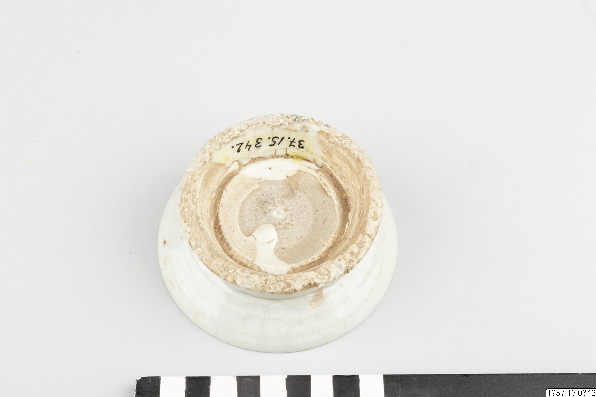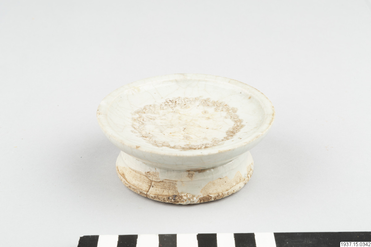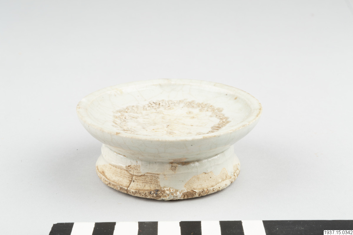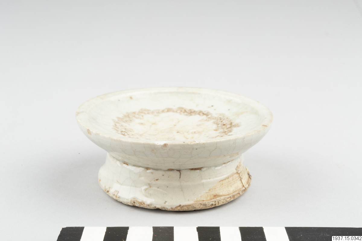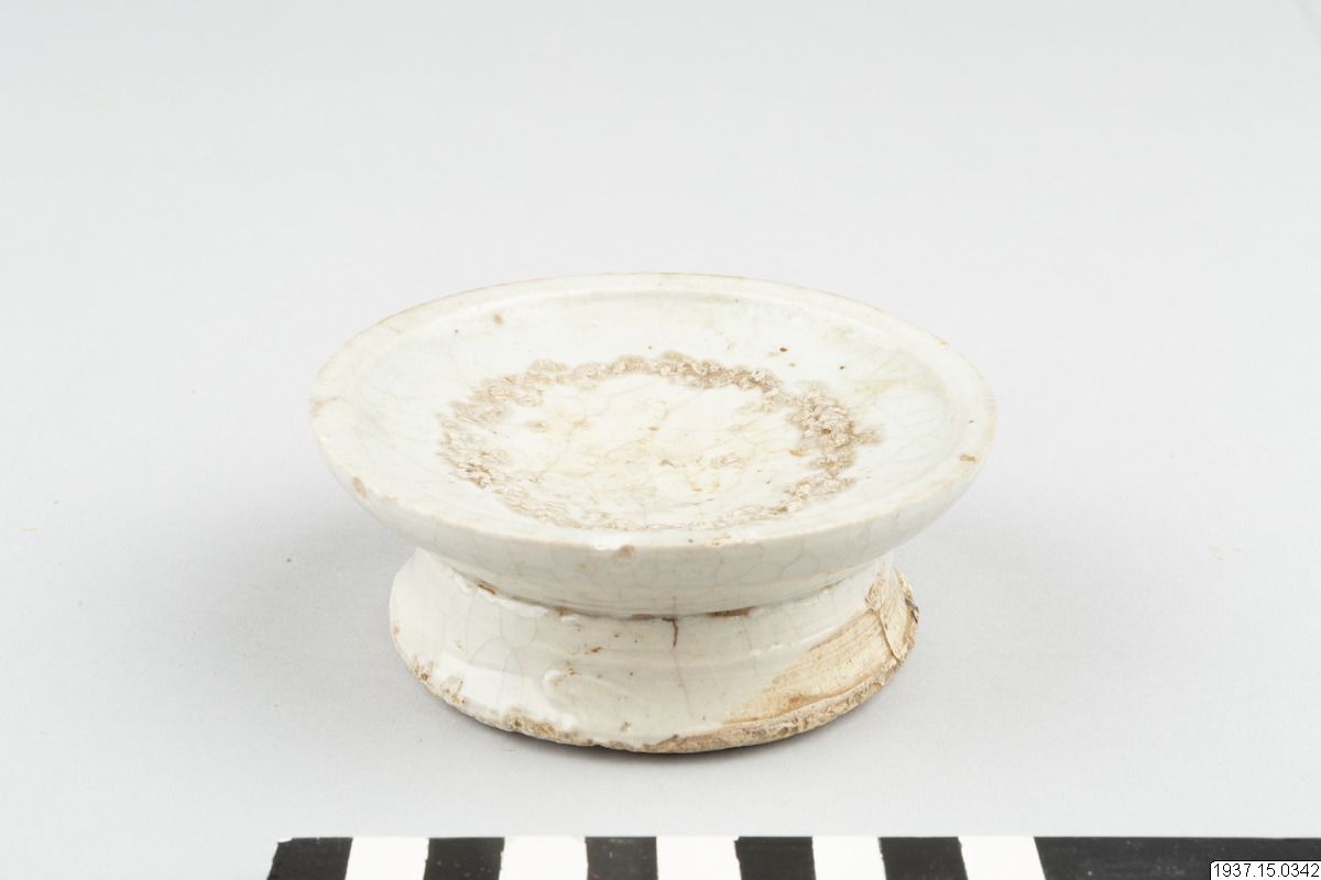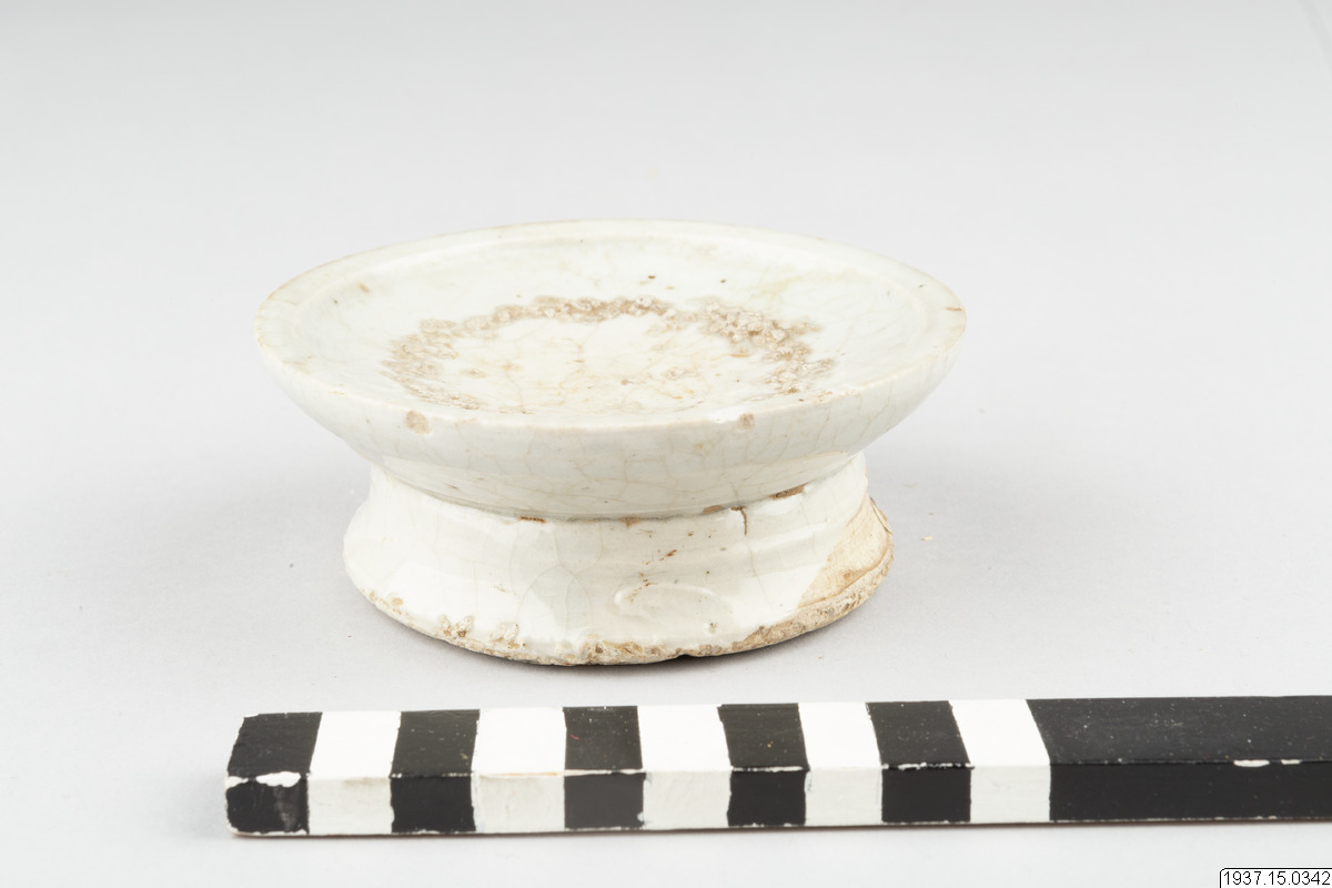 This concave, heavily potted dish is raised on a relatively high foot, which was potted separately and luted to the base of the dish. The dish is covered with a greyish-blue tinged, thick glaze with a crackle. The base and the interior of the foot are unglazed. The exterior of the foot is partly glazed. Glaze ran down from the foot onto the base. White, coarse kiln grit that served as support during firing can be seen on the footrim. A ring of the same white grit can be seen on the interior of the dish, which infers that this raised dish was fired in stack, one dish placed on top of the other. During ancestral ceremonies, offerings of traditional foodstuffs would have been neatly stacked onto the dish.