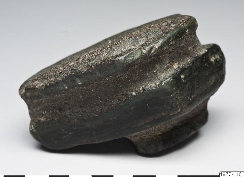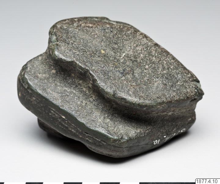 Stenföremål. En sten med gångar av hårdare mineral, mellan vilka en urvittrad fåra. Begagnas vid snoendet av tvåsträngade rep (märling) av "Majagua" (Hibiscus, sp.). Uppgives härstamma från tiden före Amerikas upptäckt. (Orig.nrs 1,340) Västindien, Portorico.