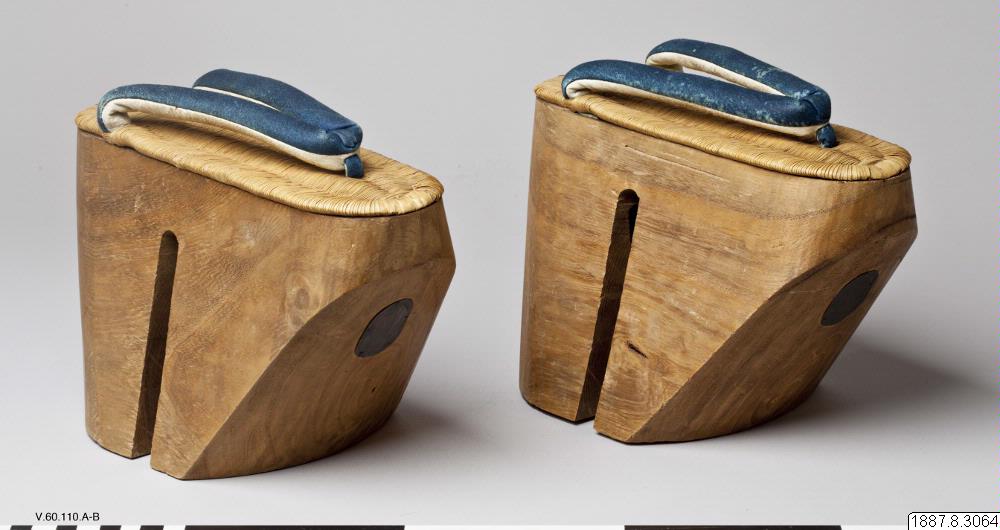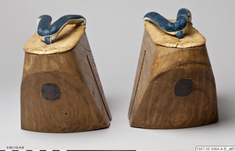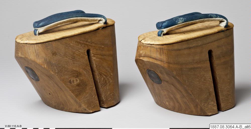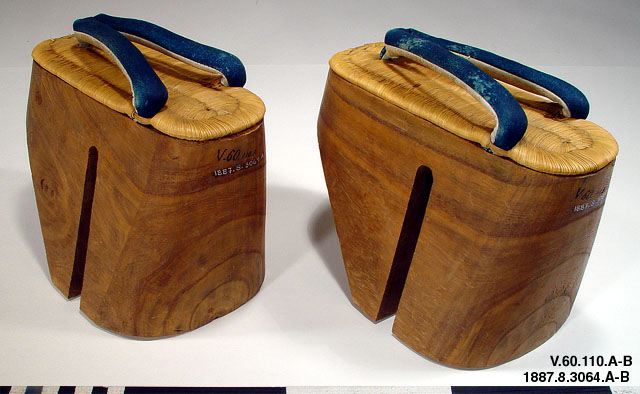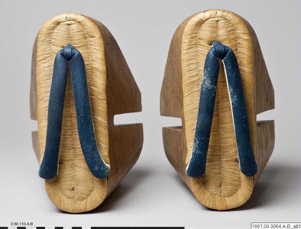 Sandaler, par. "Geta". Mycket höga, av tungt trä.Fotsulan av halmflätning. Tåband av vitt och blått skinn. (Orig. kat. nr. V.60.110) 23,5 cm x 14,5 cm. Seta. Japan. (generalkatalogen)
