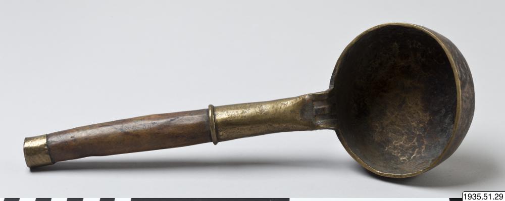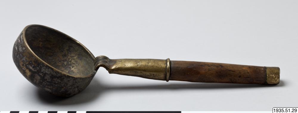 • Slev av mässing med handtag av trä.