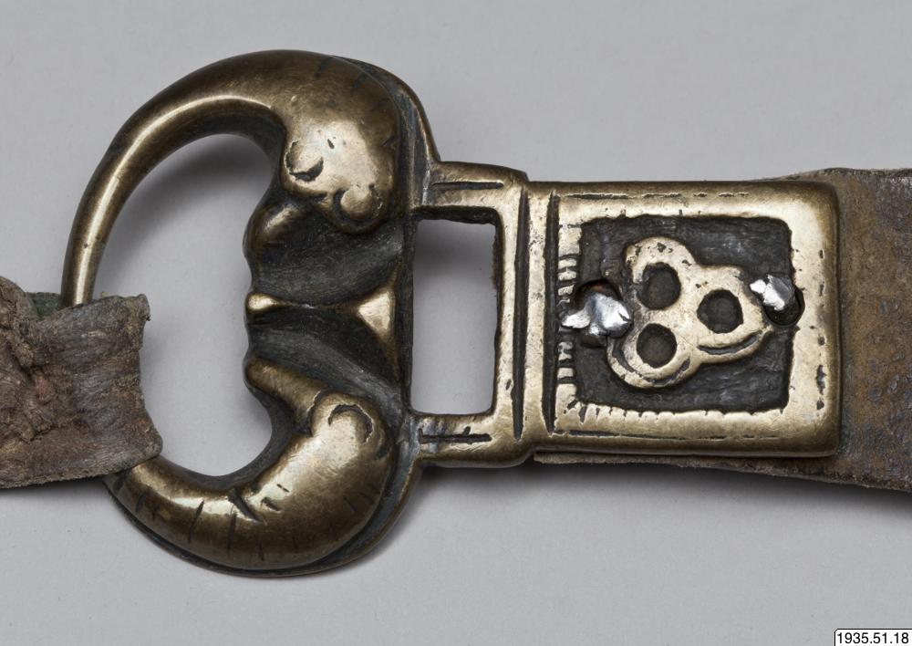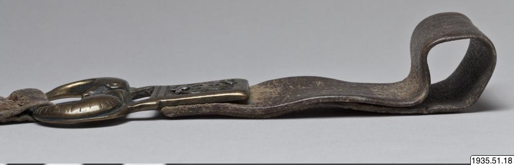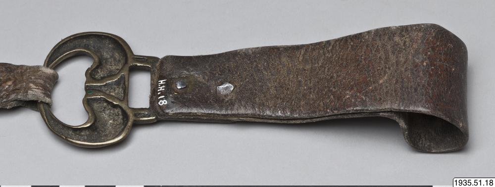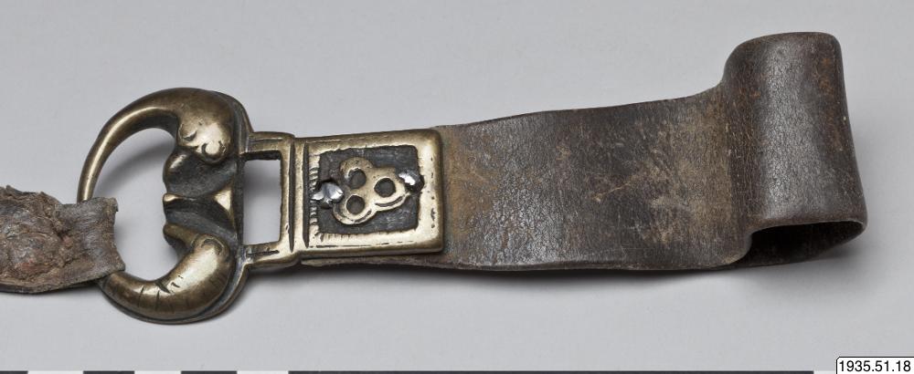• Ornamentet bärs på höger sida hängande från bältet (1935.51.19). Det är anslutet till fickan för elddon (1935.51.17) genom en läderrem.