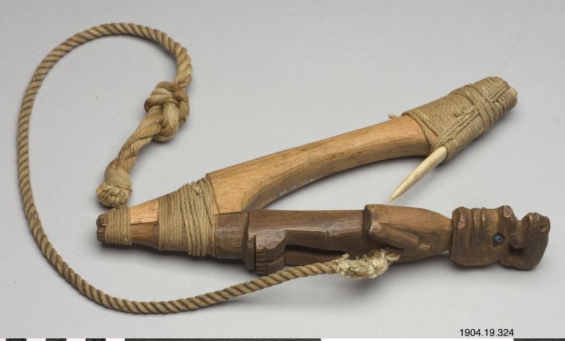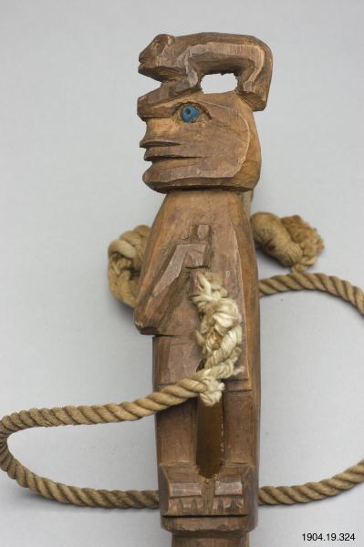 Hälleflundrekrok, nordvästkustindianerna. Kroken är av den nordliga typen och sammansatt i en v-form. Kroken har benhulling men lindningen är av modernare typ med västerländskt tillverkat repsnöre och fångstlina av rep. Den övre träarmen är snidad som en människofigur som ligger i profil. På huvudet har människofiguren en liten björn. Ögat på människofiguren utgörs av en blå glaspärla med hål i. Figuren föreställer en "spiritual helper", en slags hjälpande. De nordliga hälleflundrekrokarna är både fiskkrokar och amuletter för god fiskelycka. Enligt generalkatalogen är det en; fiskkrok med snidad människofigur av trä, närmast lik Niblack pl. XXXI, fig 155. Människofiguren i profil, har på huvudet en liten björn(?). Vidhängade tofs. Benhulling, med proveniensen British Columbia. Denna typ av krok användes av tlingit, haida och tsimshian i norr varför det är mycket troligt att den är tillverkad hos någon av dessa tre stammar./JG