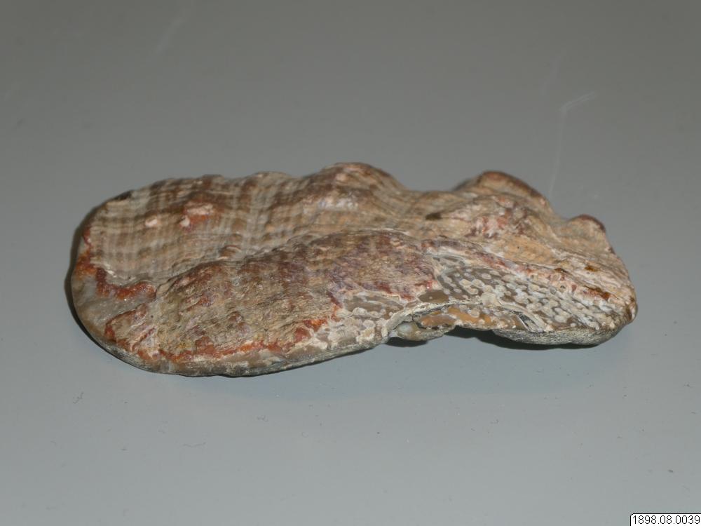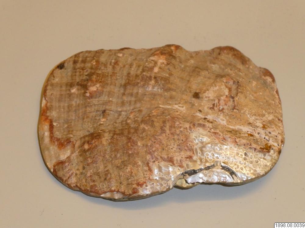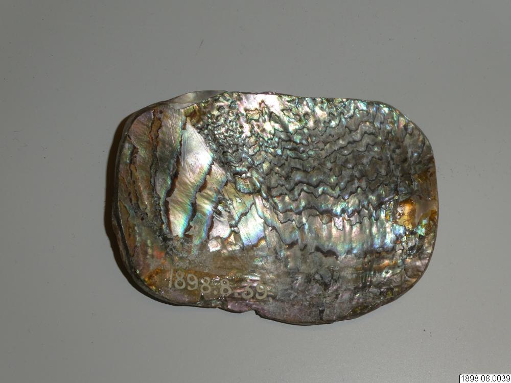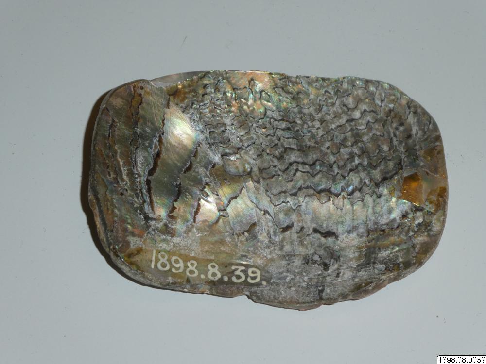 Snäckskal av Abalone. Denna typ av Abalone är den större Kaliforniska som handlare förde med sig till kusten. Den höga kvalitén, tjocklek och de starka färgerna gjorde den mer populär än den mindre inhemska som användes i viss omfattning till smycken, speciellt förhistoriskt. Enligt generalkatalogen är detta, ett något arbetat ovalt snäckskal som börjat arbetas till något smycke, men ej fullbordats. Exakt proveniens kan ej fastställas. Båda typerna av Abalone används fortfarande./CJG
