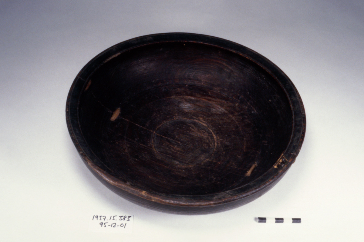 Fat, svarvat, med rotting som sammanbinder de två delarna. Det är en koreansk specialitet att svarva trä till funktionella vardagsartiklar. Ofta var de ocskå lackerade eller behandlade med både lack och olja. Fortfarande är svarvare verksamma. Ofta används färskt, t o m "grönt", trä trots risken för framtida sprickor. Vanligtvis uppkommer dock ej sådant eller förekommer endast i ringa utsträckning. Det är vanligt med en enkel dekor i form av ett par horisontella, inskurna linjer som, tillsammans med tydliga märken efter svarvens sista varv, bidrar till en estetisk upplevelse av dessa bruksföremål. Litt.: Moes, Robert J.: Korean Art. From The Brooklyn Museum Collection. 1987. New York, s 189, nr 92.(PH 960426)