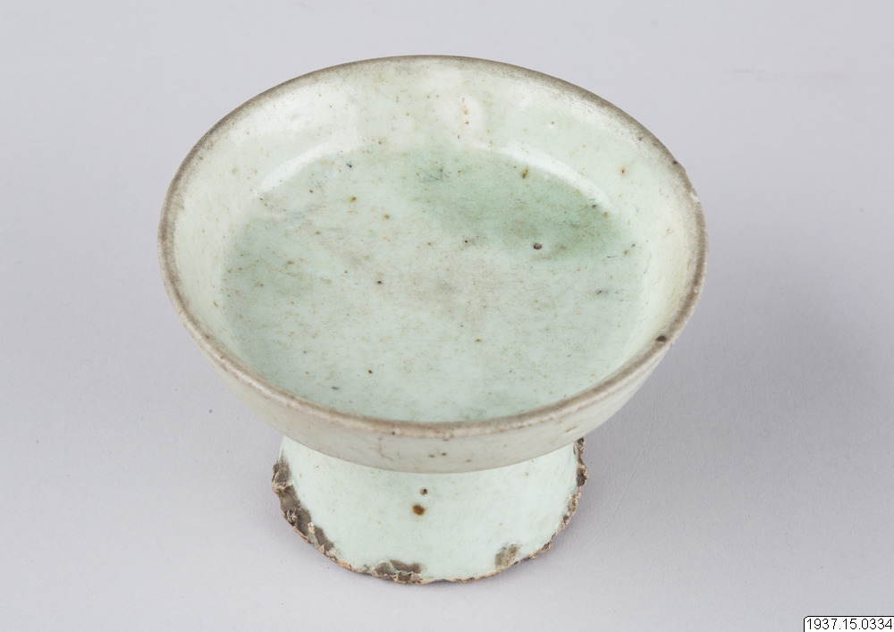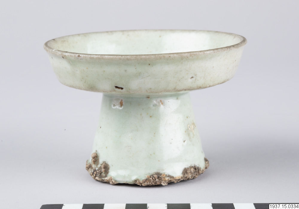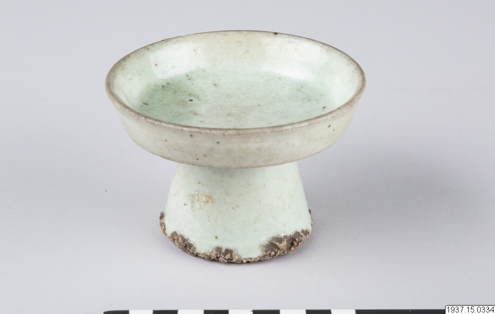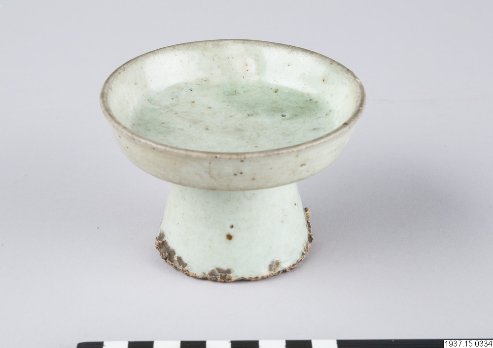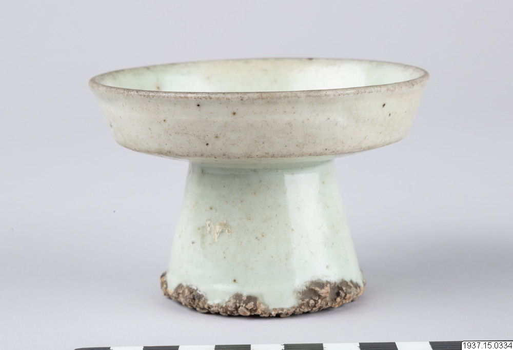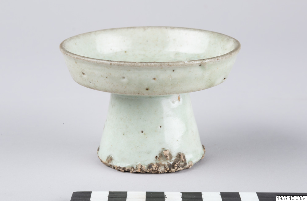 This dish has a high slightly everted rim and is raised on a conical, hollow pedestal. The bluish tinged, thick glaze that covers the whole surface is irregular and has some bubble bursts. Coarse kiln grit covers the footrim. During ancestral ceremonies, offerings of traditional foodstuffs would have been neatly stacked onto the dish.