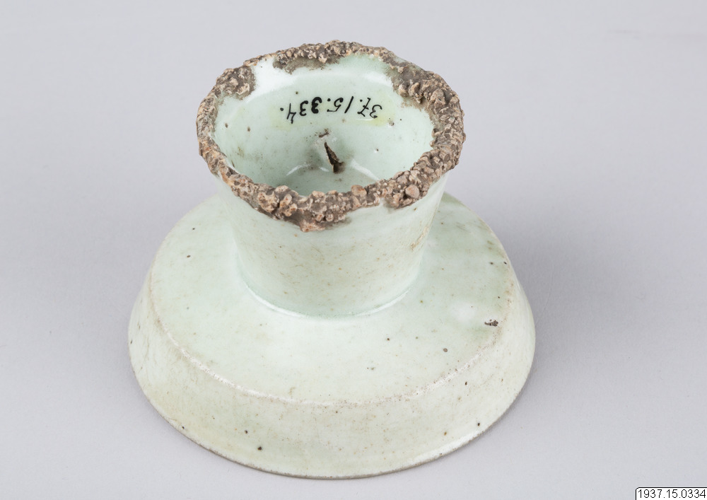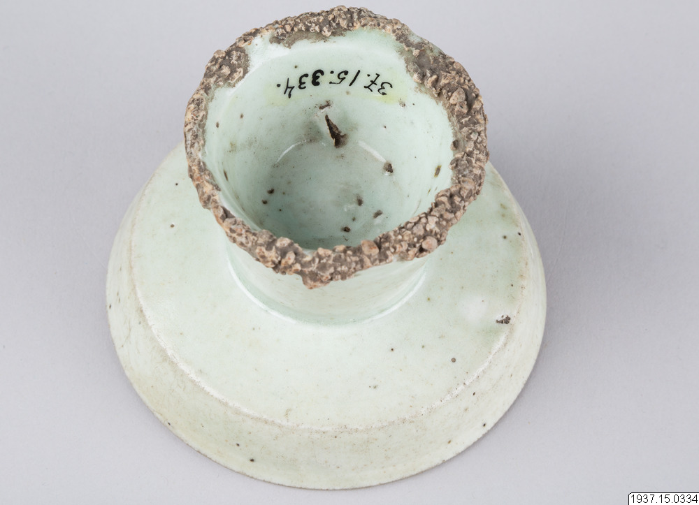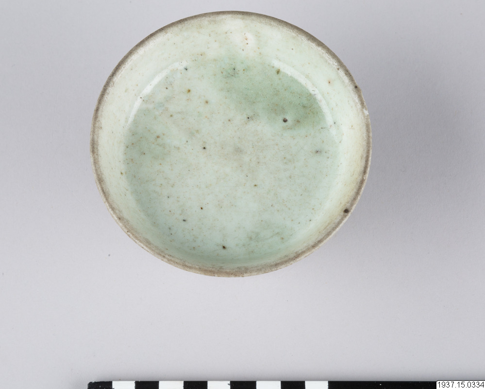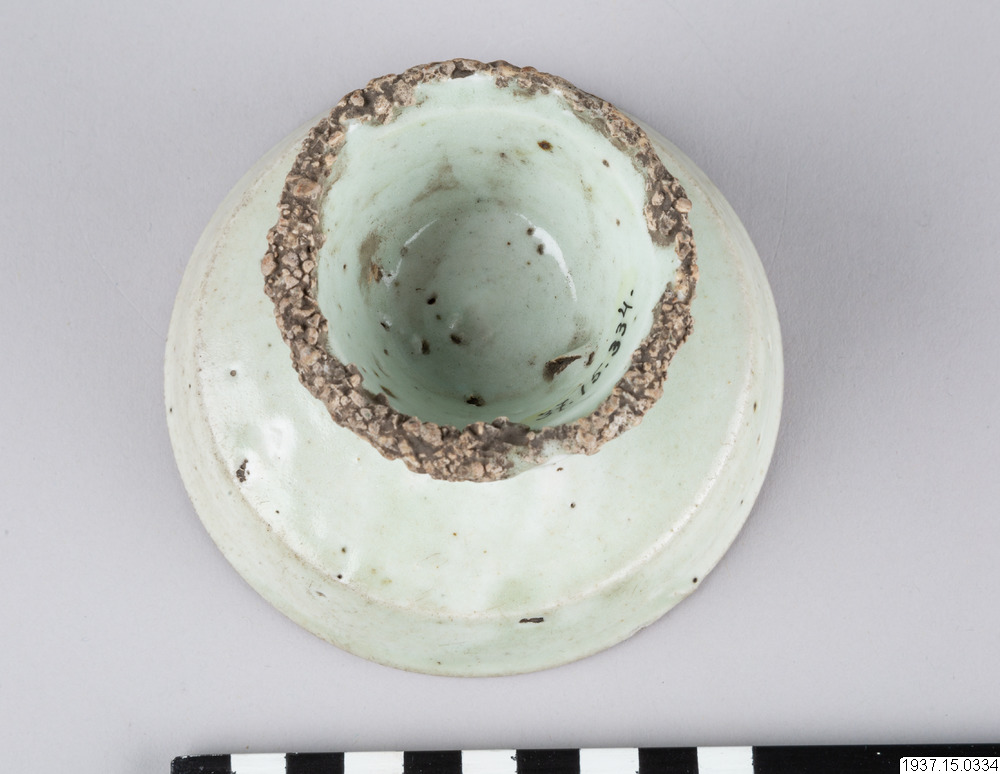 Ställ eller flat skål på fot, av stengods, med grågrönvit glasyr (troligen järnhaltig), med rester av tillverkningsprocessen kring foten. (PH 960426)