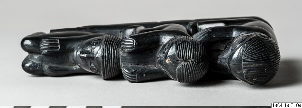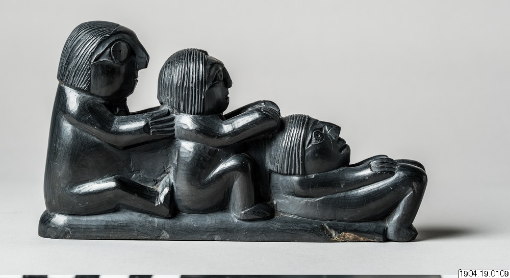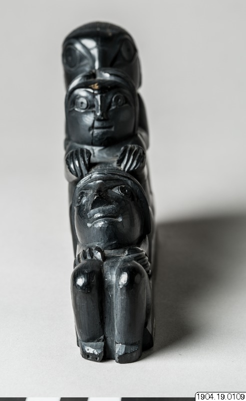 Argillitskulptur Haida. Skulpturen är utförd som en grupp av tre figurer vilka alla håller i varandra. Den största figuren är den sista, baktill på skulpturen. Den föreställer troligen ett djur transformerat till människa att döma av ögonen och näsan. Detta är ett mycket vanligt motiv i Haida-mytologin. De två andra figurerna är mänskliga. Den i mitten sittande, den främsta liggande. Enligt generalkatalogen anges bara grupp i svart skiffer: 2 sittande, en liggande mänsklig figur, med proveniensen British Columbia. En del skador finns, bl.a. en del sprickor, varav en tycks löpa genom hela de två största figurerna./CJG