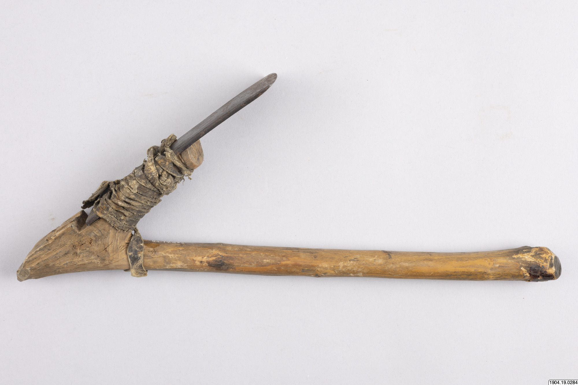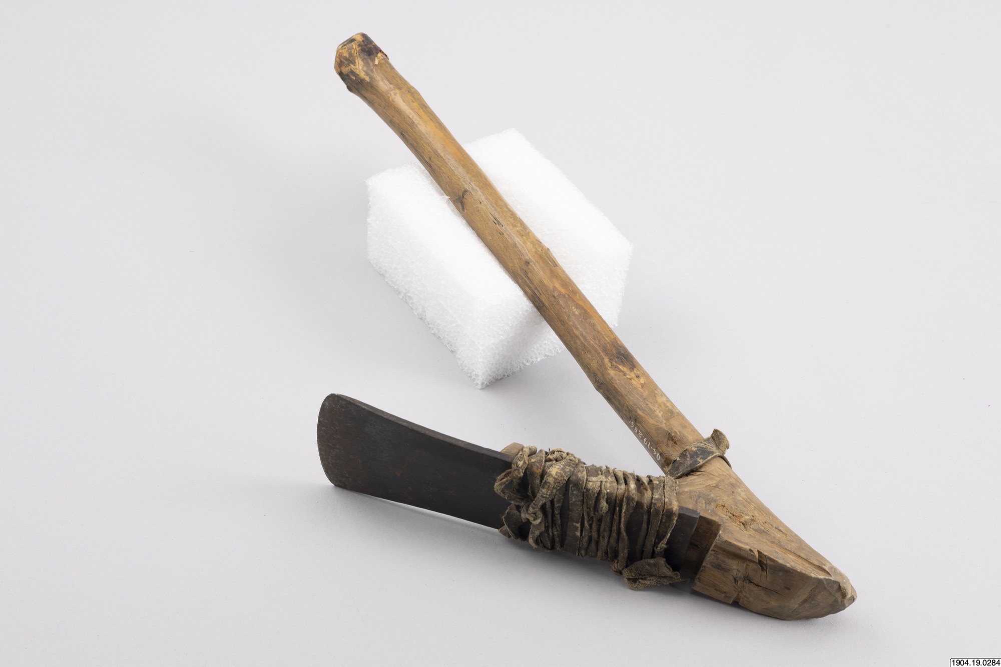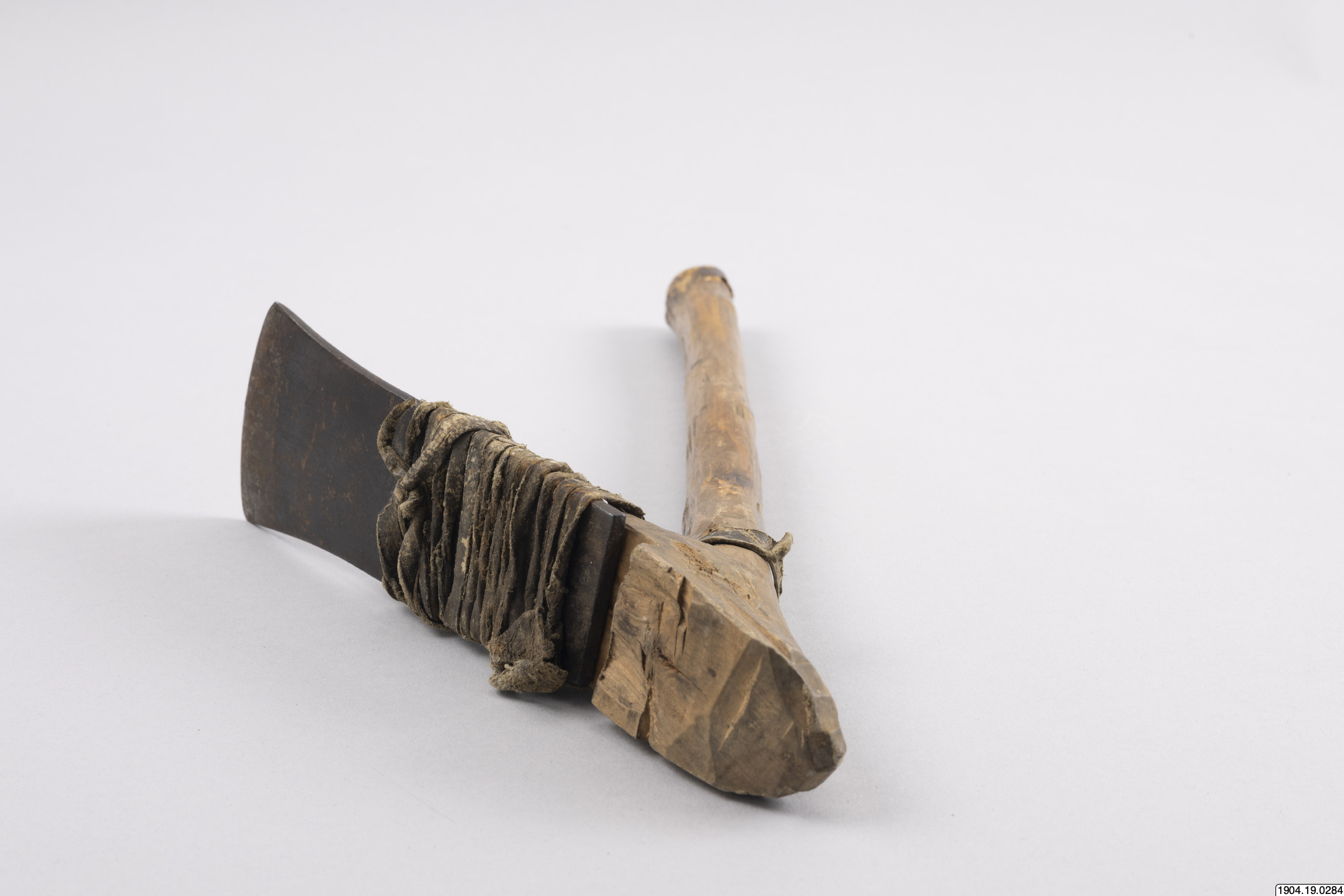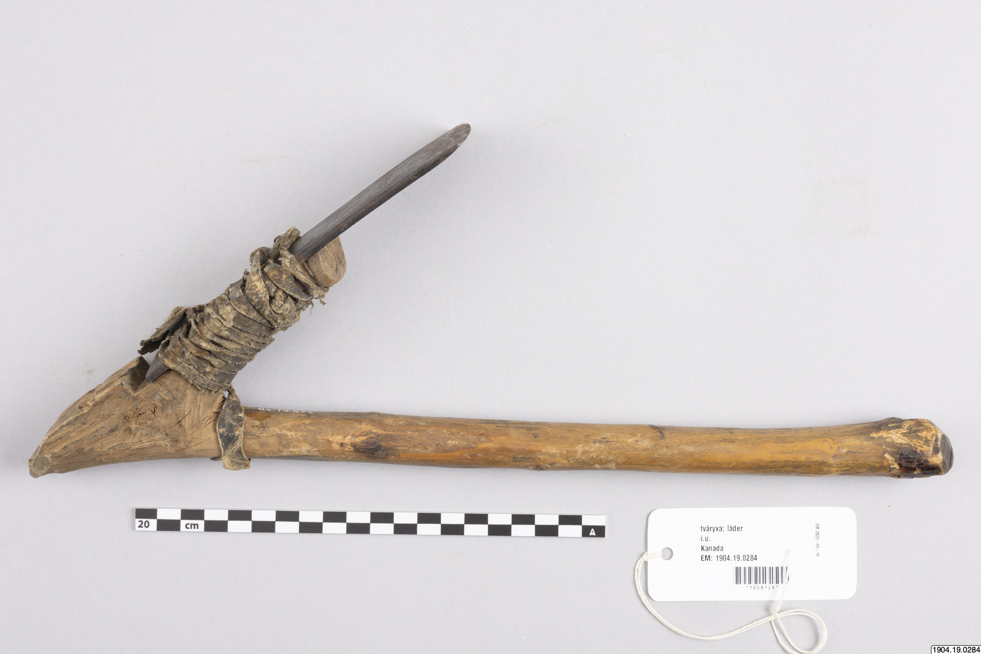 Tväryxa av järn med träskaft. Enligt generalkatalogen är detta en, yxa av järn, med träskaft. "Kanot-yxa", "Tekta", Jacobsen nr 24, med proveniensen British Columbia, Bella Coola. Då föremålet köpts in av Fillip Jacobsen som i många år bodde på olika platser längs kusten, bland annat gjorde han en längre vistelse i Tallio, där Bella Coola indianerna bland annat bor, kan vi räkna med att denna proveniens stämmer samt troligen också användningsområdet. Jacobsen publicerade också två artiklar i Ymer om nordvästkustindianerna. Tväryxan är i fint skick. Bladet är t.ex förvånansvärt lite rostanlöpt. Tväryxor av denna typ användes främst av de nordliga grupperna Tlingit, Haida, och Tsimshian, och av södra Kwakiutl. I den aktuella situationen används de över hela kusten, och ser ut, i sin moderna form, ungefär som 04.19.284. Bladen är idag dock ofta limmade och surrade med fin tråd. Indianerna utförde större delen av sina sniderier med dessa tväryxor, allt ifrån grov uthuggning till mer elaborerade arbeten. För de mer detaljerade arbetena användes och används fortfarande skedkniven, se t.ex 04.19.274 och 04.19.276./JG