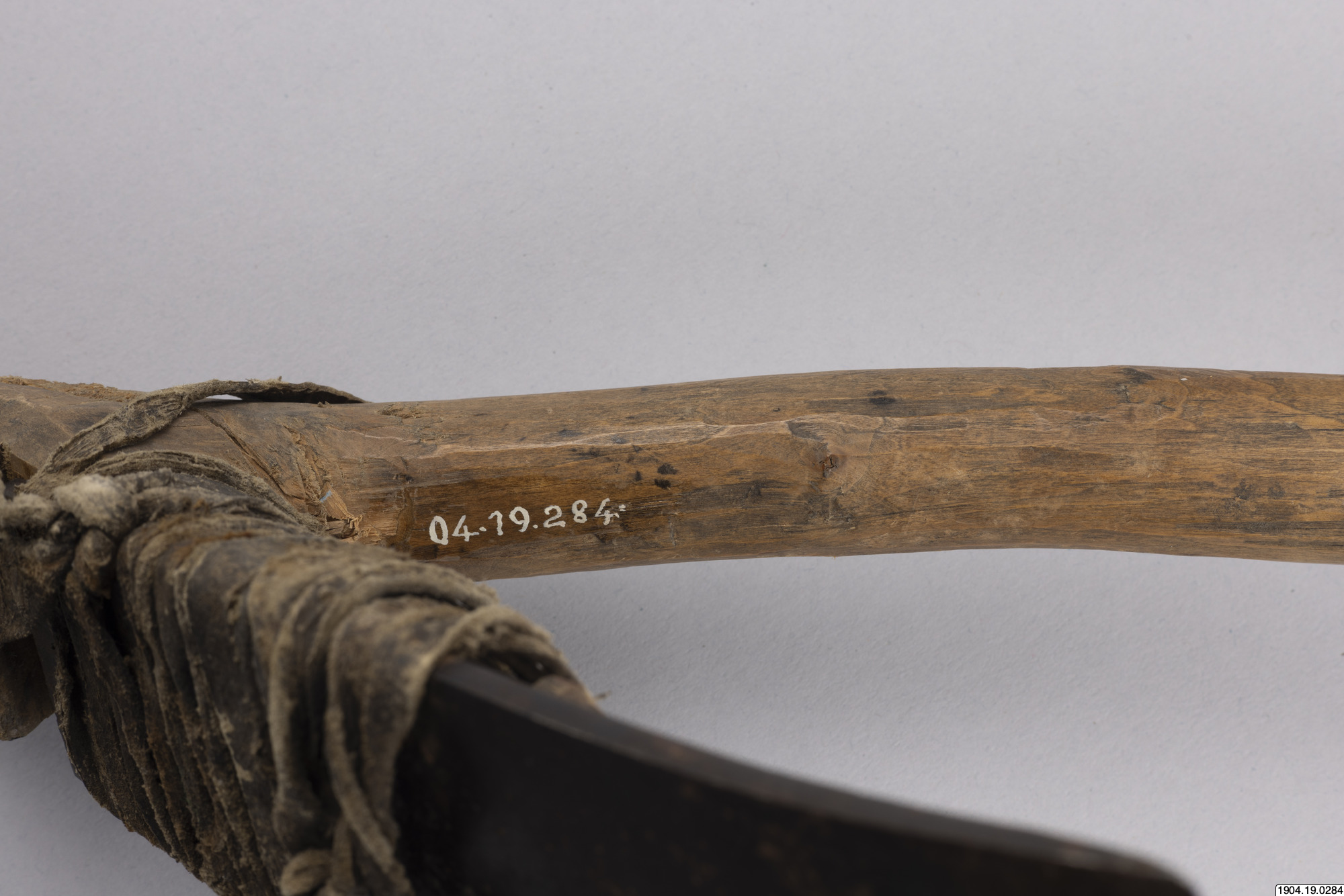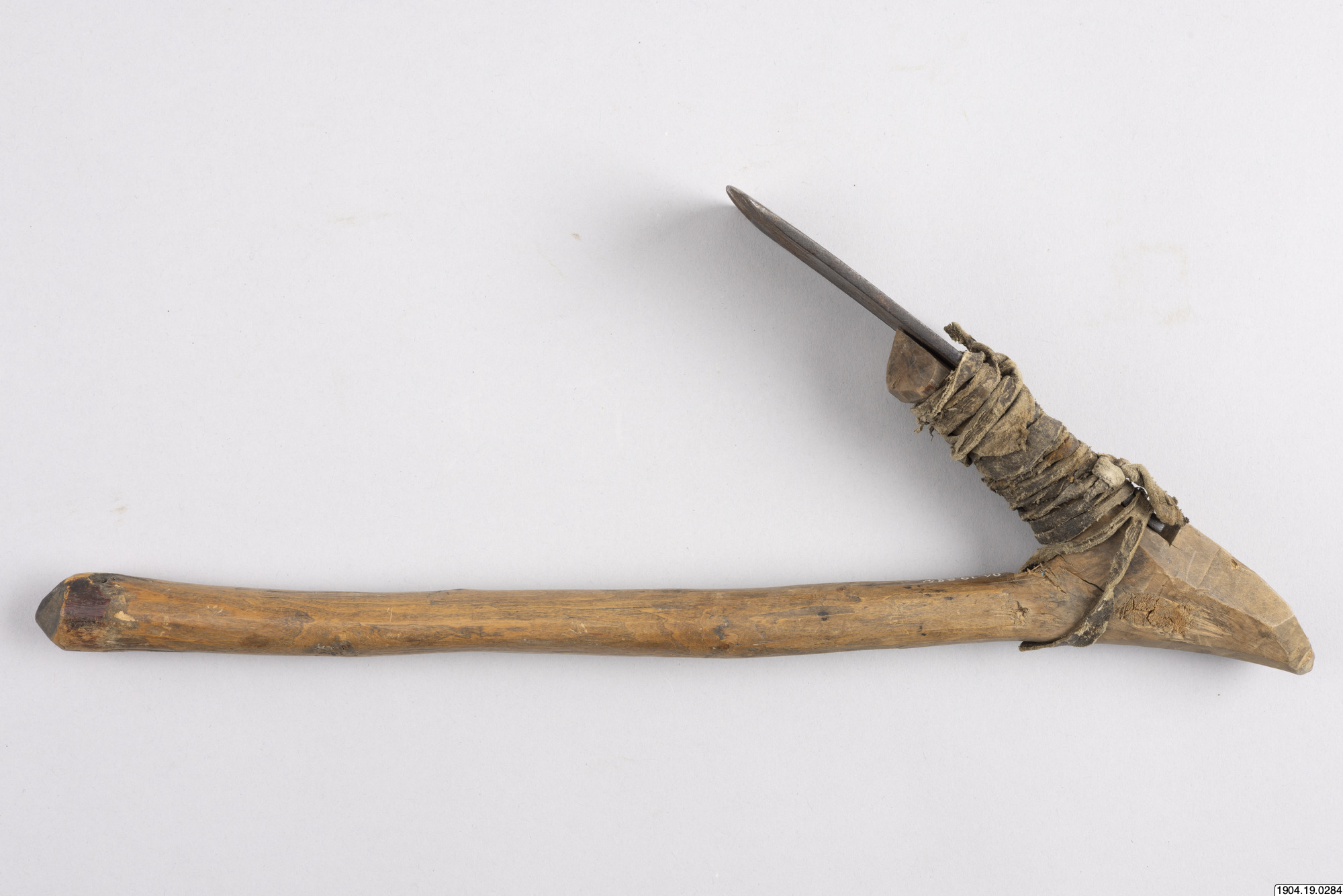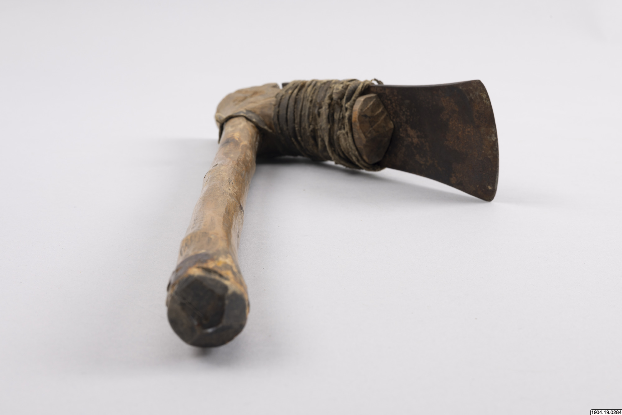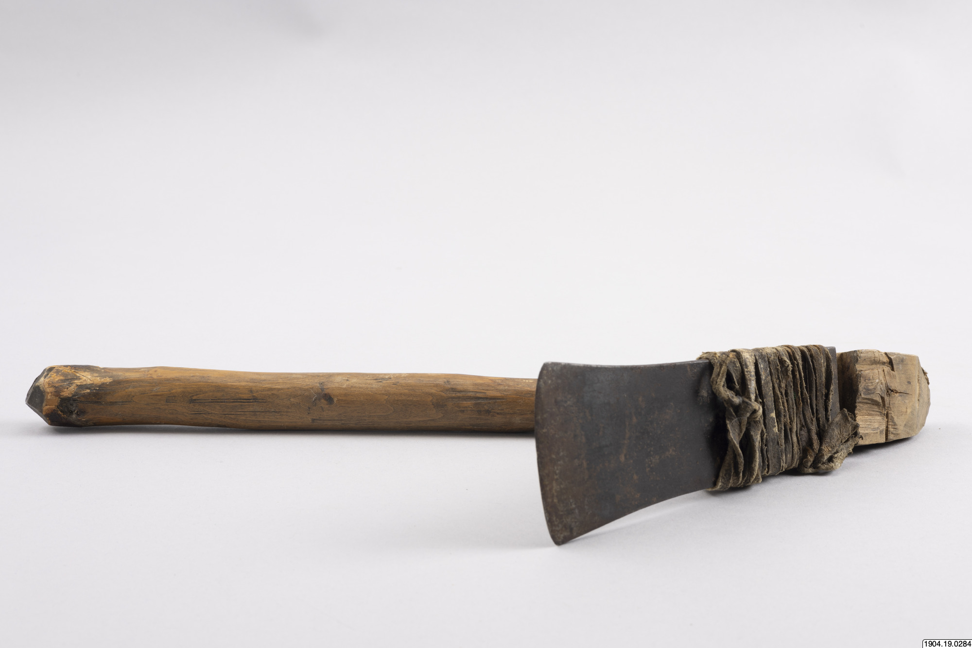 Tväryxa av järn med träskaft. Enligt generalkatalogen är detta en, yxa av järn, med träskaft. "Kanot-yxa", "Tekta", Jacobsen nr 24, med proveniensen British Columbia, Bella Coola. Då föremålet köpts in av Fillip Jacobsen som i många år bodde på olika platser längs kusten, bland annat gjorde han en längre vistelse i Tallio, där Bella Coola indianerna bland annat bor, kan vi räkna med att denna proveniens stämmer samt troligen också användningsområdet. Jacobsen publicerade också två artiklar i Ymer om nordvästkustindianerna. Tväryxan är i fint skick. Bladet är t.ex förvånansvärt lite rostanlöpt. Tväryxor av denna typ användes främst av de nordliga grupperna Tlingit, Haida, och Tsimshian, och av södra Kwakiutl. I den aktuella situationen används de över hela kusten, och ser ut, i sin moderna form, ungefär som 04.19.284. Bladen är idag dock ofta limmade och surrade med fin tråd. Indianerna utförde större delen av sina sniderier med dessa tväryxor, allt ifrån grov uthuggning till mer elaborerade arbeten. För de mer detaljerade arbetena användes och används fortfarande skedkniven, se t.ex 04.19.274 och 04.19.276./JG