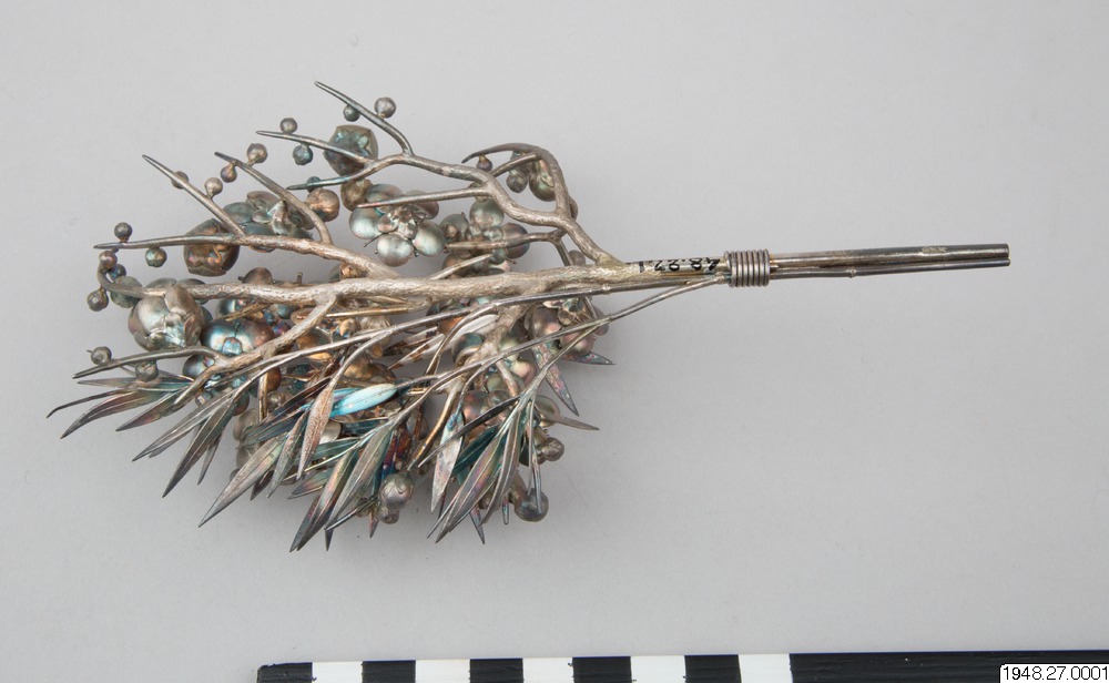 Hårprydnad i silver i form av blombukett, en blommande prunus-kvist (ett slags plommoblom) samt bambu, i realistisk stil. Kvisten ömsliuts av ett papper som vikts runt stjälkarna och knutits med mizuhiki (traditionellt japanskt knutarbete) i grönskimrande metall, guld och vitt. Papperet är på framsidan prytt med två svalor och en fjäril tryckta i guld. Prydnaden har använts i den höga, traditionella frisyren som kräver ett eller flera hårornament för att bli fullständig. Ume (prunus) symboliserar den annalkande våren, övergången mellan vinter och vår, då den sköra blomman blomstrar på bar kvist mitt i kylan. Symboliskt har detta kommit att stå för oförvägenhet, härdighet och mod. (PH 960607) Längd ca 18 cm. Japan (Foto finns bildarkivet) Katalogen upprättad av prof,. Y. Laurell.